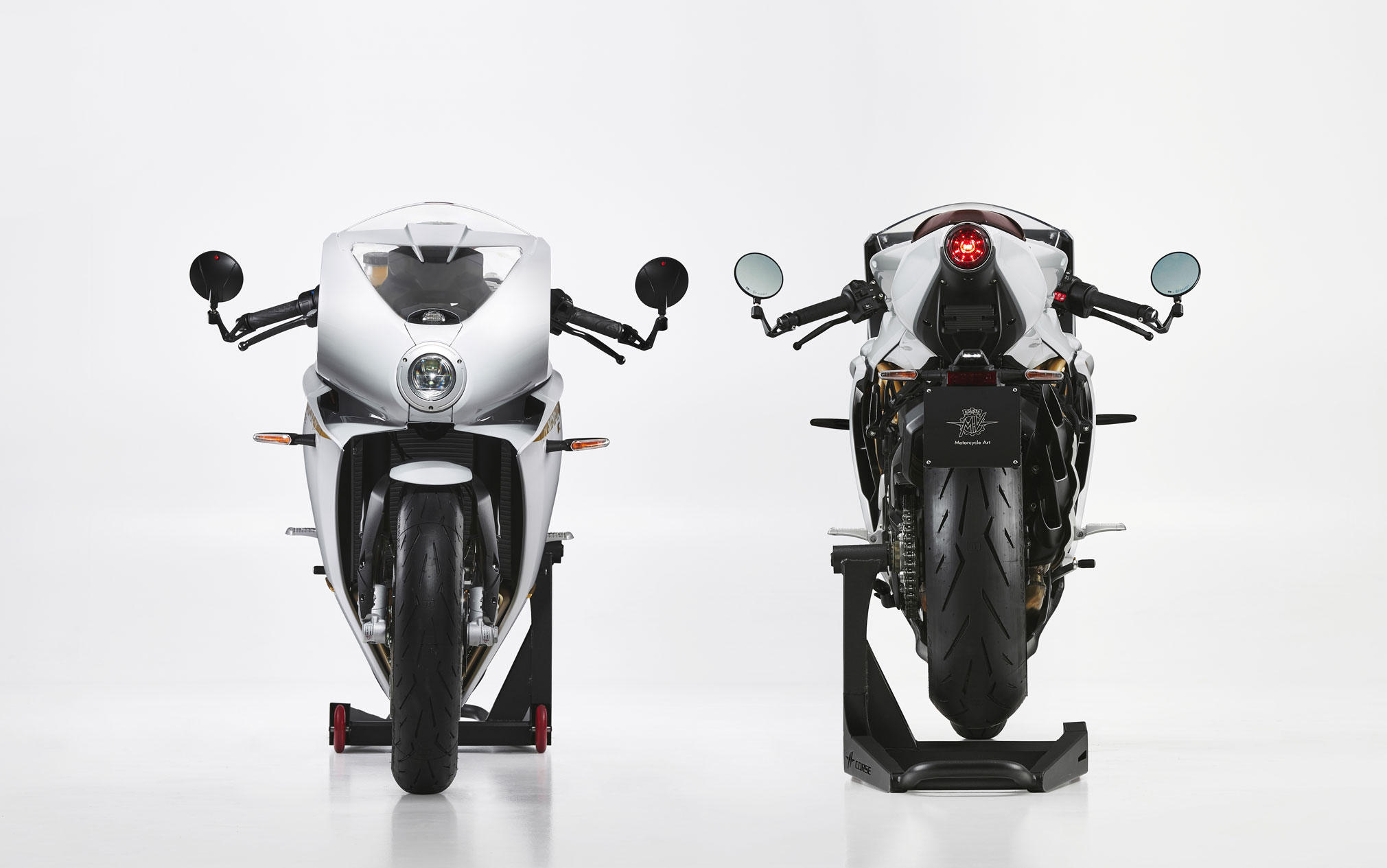 The new MV Superveloce S takes attention to detail to the extreme. The new Surreal White exterior highlights the timeless lines, which were designed in a wind tunnel. The spoke wheels are an elegant tribute to the bikes of the past, but with the efficiency and weight of a modern wheel.