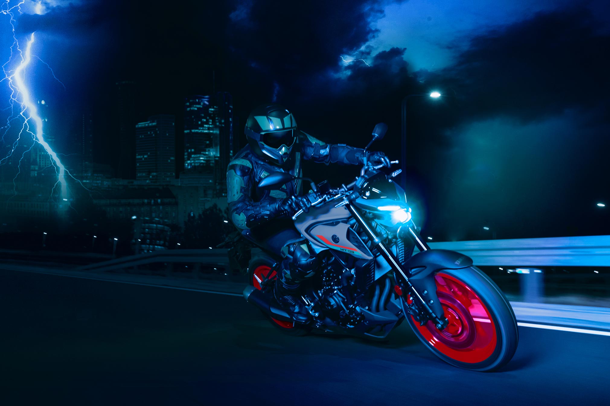 The dynamic MT-03 looks cool with its dual angled position lights that emphasize its aggressive big-bike looks. A single compact and powerful LED headlight burns a hole through the darkness to light up the road ahead. - Aggressive Next-Gen MT Design
