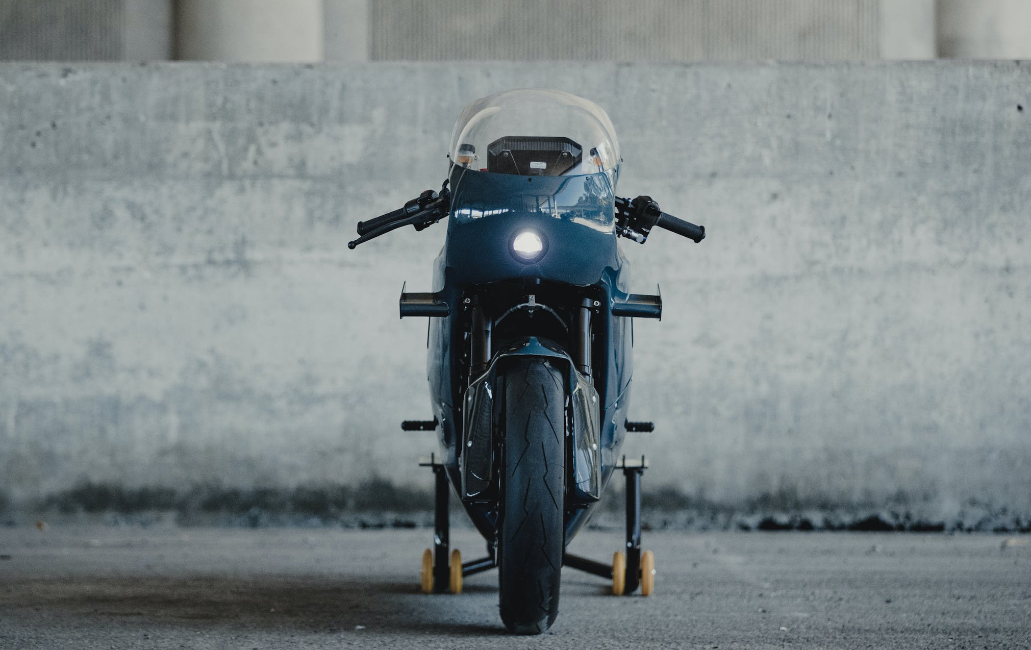 WOOLIE: I had the whole bike shaped and it looked really nice, but I thought, you know, it’d be neat to put some wings on it because wings are just cool. And, we had a piece of a winglet from a formula one car that we were able to cut up and I made some end caps. The end caps are basically a visual knockoff from a Porsche race car. I mounted them on there and I thought they looked great. The winglets will tend to stabilize the bike quite a bit more than you’d think, you know, especially at speed and add a little bit of downforce. But mostly I just felt like it added another detail that was cool and different.
