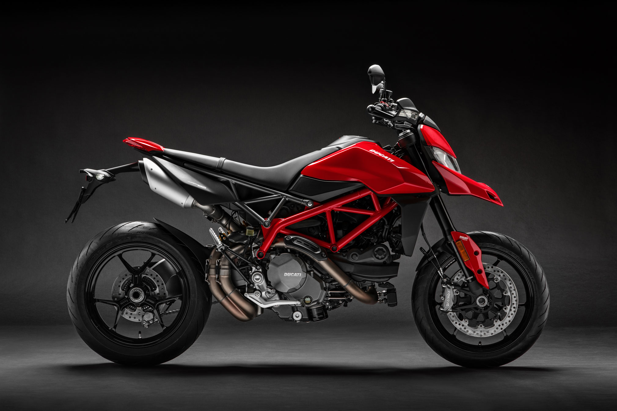 The Hypermotard 950 family is equipped with a revised version of the 937 cu cm twin-cylinder Ducati Testastretta 11°.