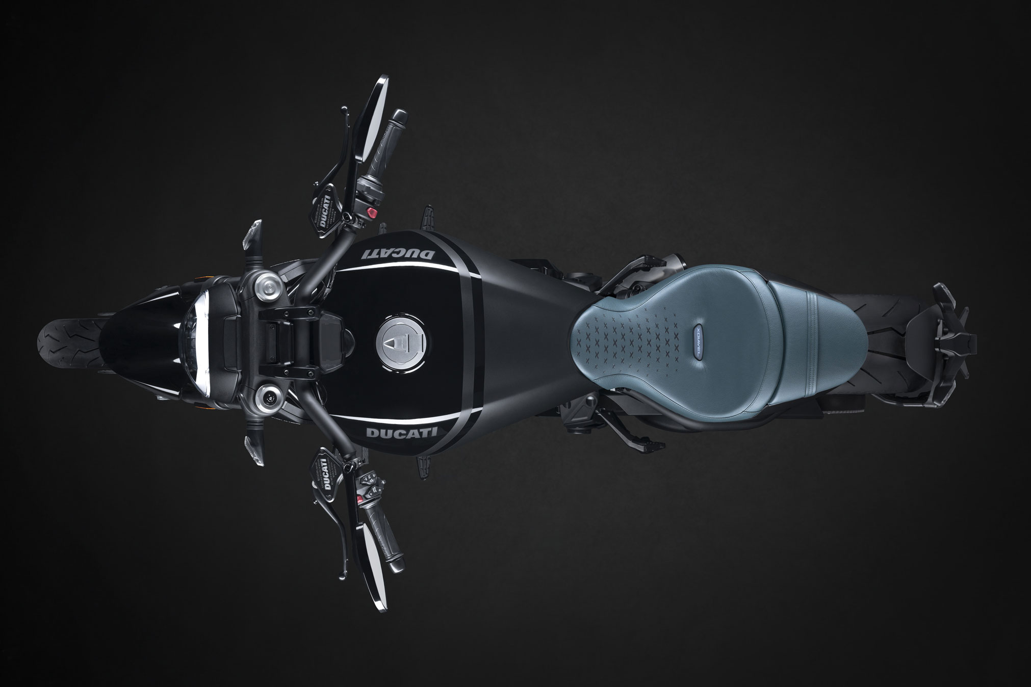 The most recognizable part of the XDiavel Nera is the special seat made of Pelle Frau®: a soft natural leather saddled by hand, the result of years of research by Poltrona Frau. It is available in five different colours (Siam Red, Steel Blue, Cemento, India and Selva) and is customized with a series of “X” engraved through a sophisticated laser process, which recall the name of the bike.