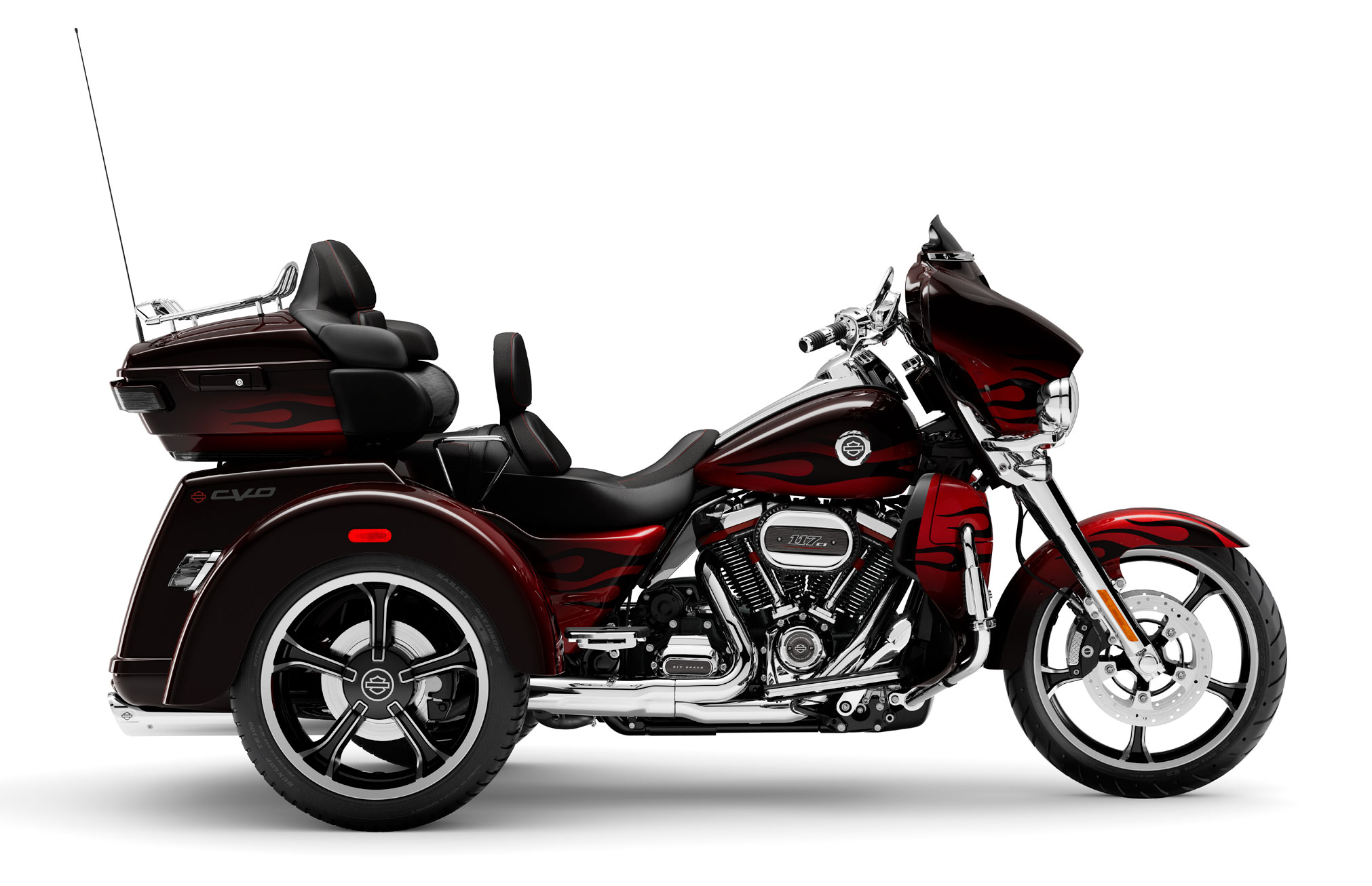 CVO Tri Glide Model is a super-premium trike offering distinctive style, powerful performance and long-haul touring capability plus the added confidence of a third wheel. The CVO Tri Glide is loaded with premium audio, luxurious comfort features and an astounding finish and attention to detail, on a chassis designed from the wheels up as a trike.