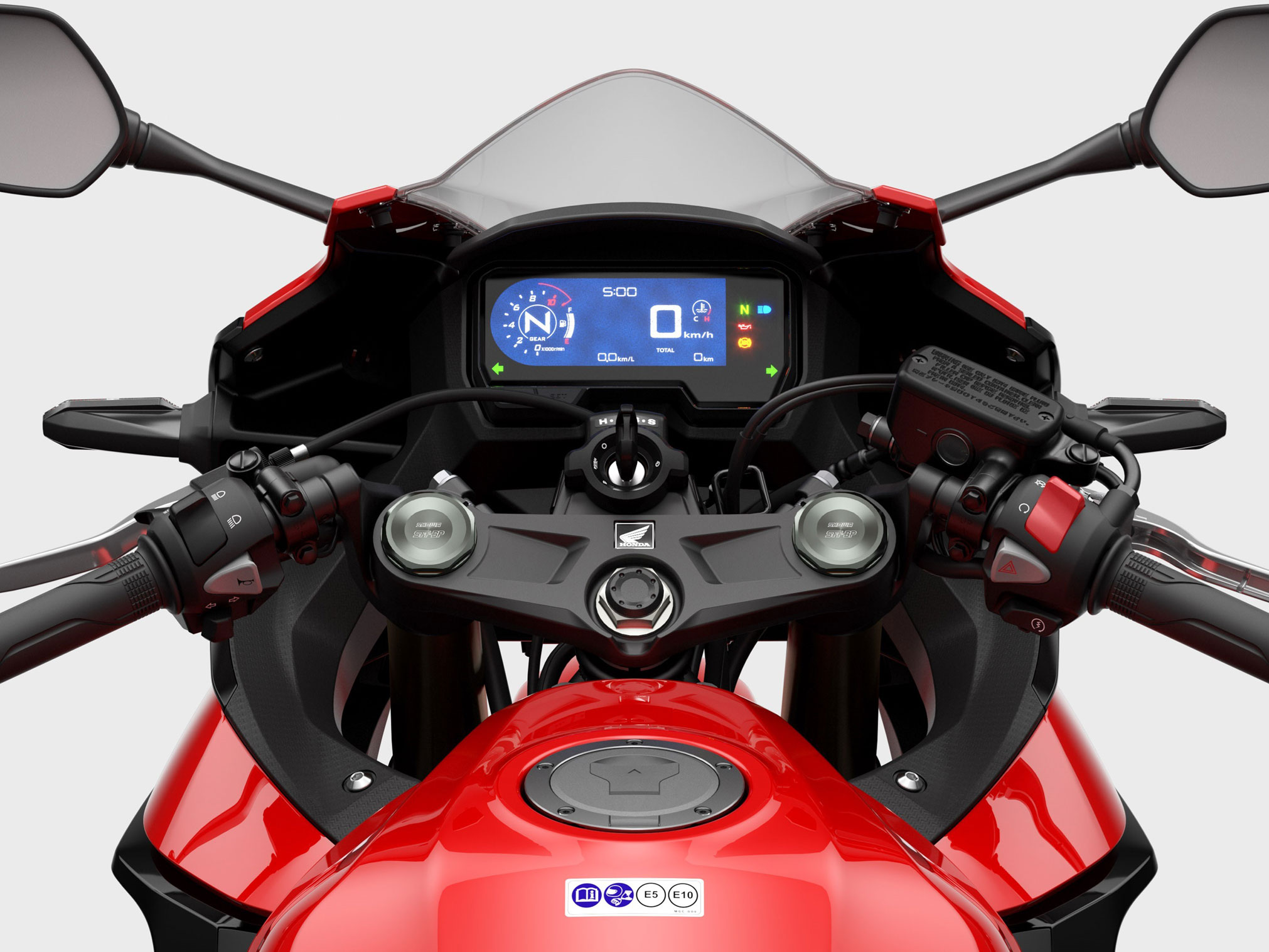 New sharply-chiselled dual LED headlights, inherited from the CBR650R, stare menacingly ahead with a wider volume of light emission, matching by LED indicators. LCD instruments feature a Gear Position and Shift Up indicator; this is set to a default 8,750rpm but can be adjusted in 250rpm increments between 5-8,750rpm.
