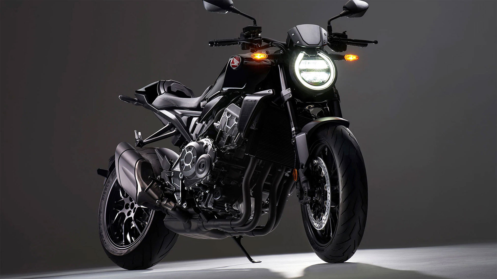 The CB1000R Black Edition’s round-styled LED headlight is powerful and bright, and sets the tone for the bike’s no-nonsense Neo-Sports Café streetfighter presence.