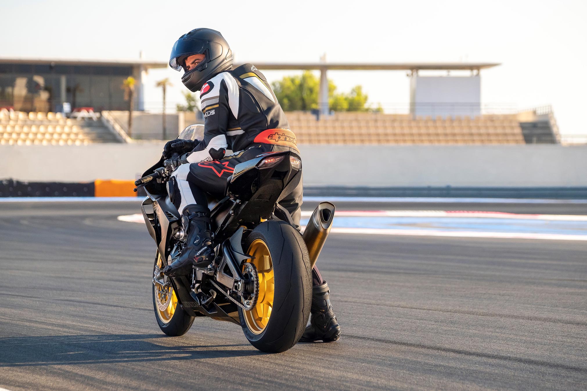Öhlins Smart Electronic Control (SE-C) 43mm NPX forks and TTX36 rear shock offer race-quality suspension, with settings managed by second-generation Öhlins Object Based Tuning interface (OBTi). The front discs are worked by Brembo Stylema four-piston calipers and Brembo brake lever/master cylinder, while the ABS is adjustable for track riding.