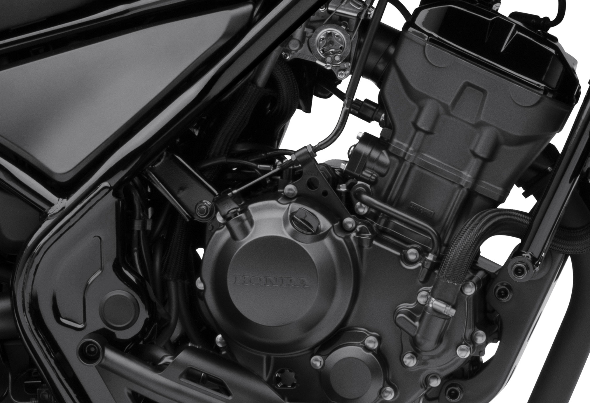 - Rebel 500 crankcases use centrifugally cast thin-walled sleeves. Their internal design reduces the “pumping” losses that can occur with a 180° phased firing order. A deep oil sump holds 3.2 liters.