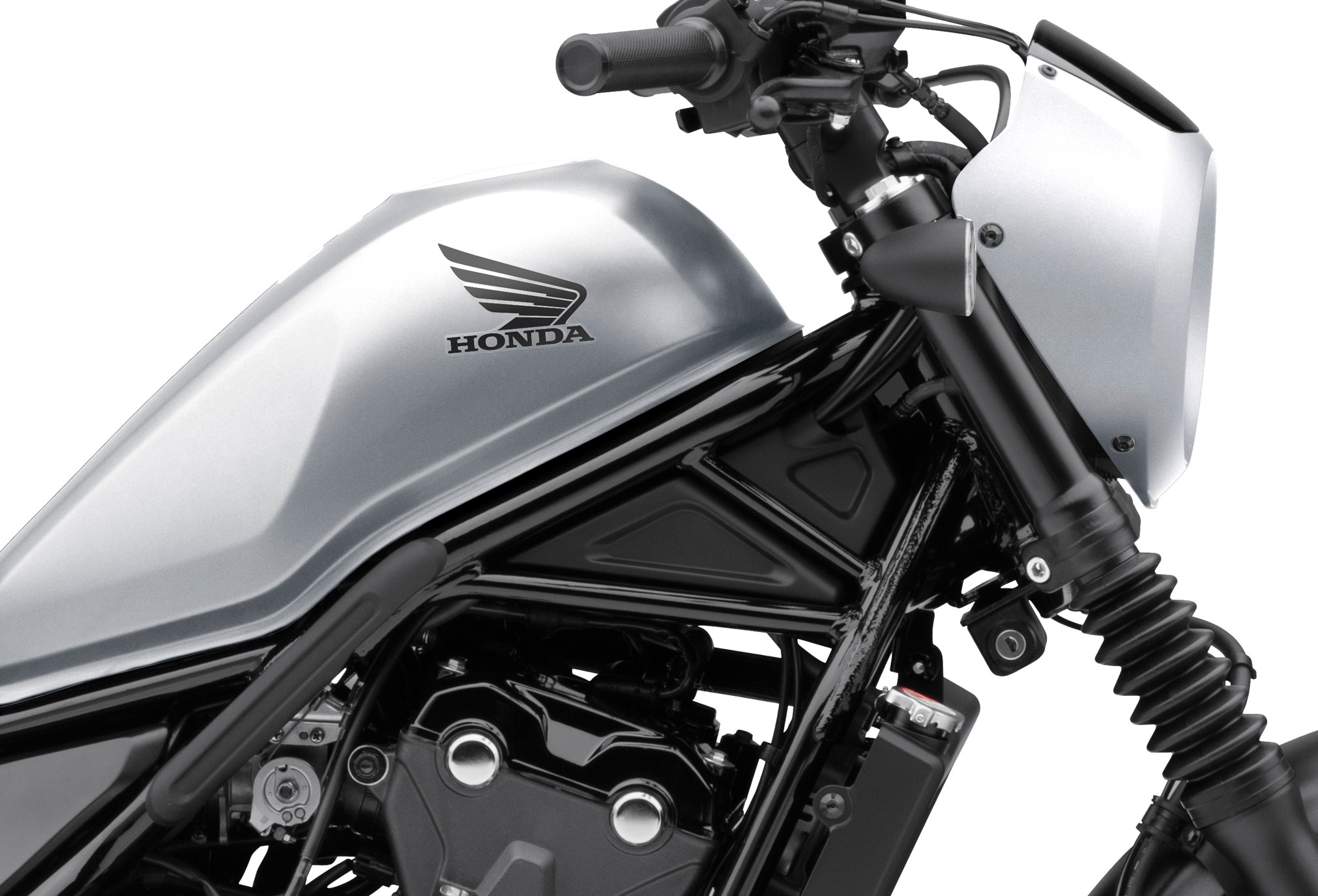 - To support the Rebel’s low-slung look, its attractive tubular-steel frame holds the engine in three places and is designed to be as narrow as possible around the rider’s inseam. Trail is set at 110 mm, with 28° rake.