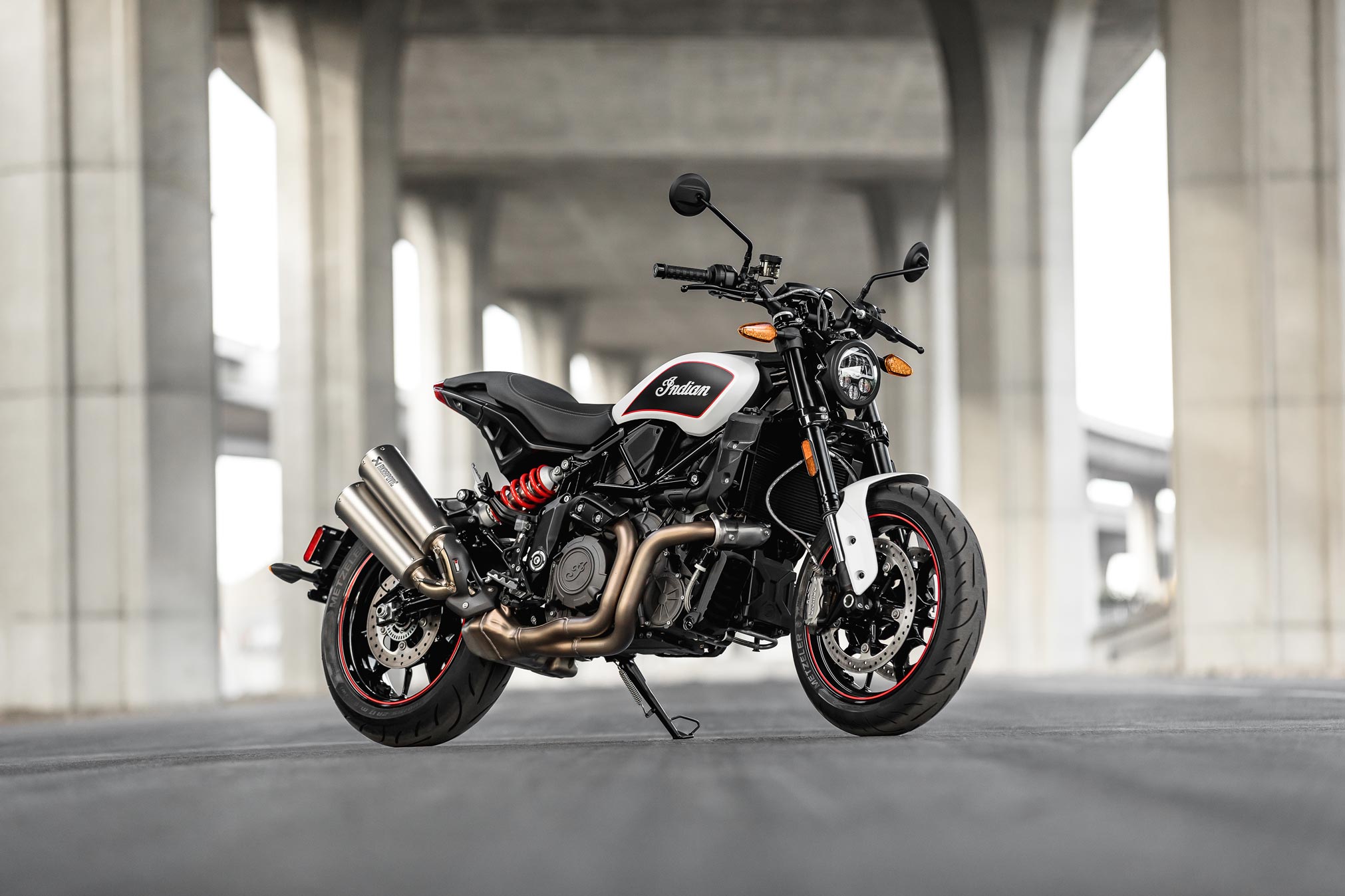 As the premium offering, the FTR S includes Indian Motorcycle’s 4.3-inch Ride Command touchscreen display, which offers phone integration via Bluetooth or USB and configurable gauges. The FTR S is standard with an upgraded Akrapovicˇ exhaust, three ride modes, wheelie control with rear lift mitigation, stability control, traction control and cornering ABS. Additionally, a fast-charging USB port provides a convenient means to staying charged. Two paint options are available: Maroon Metallic and White Smoke.