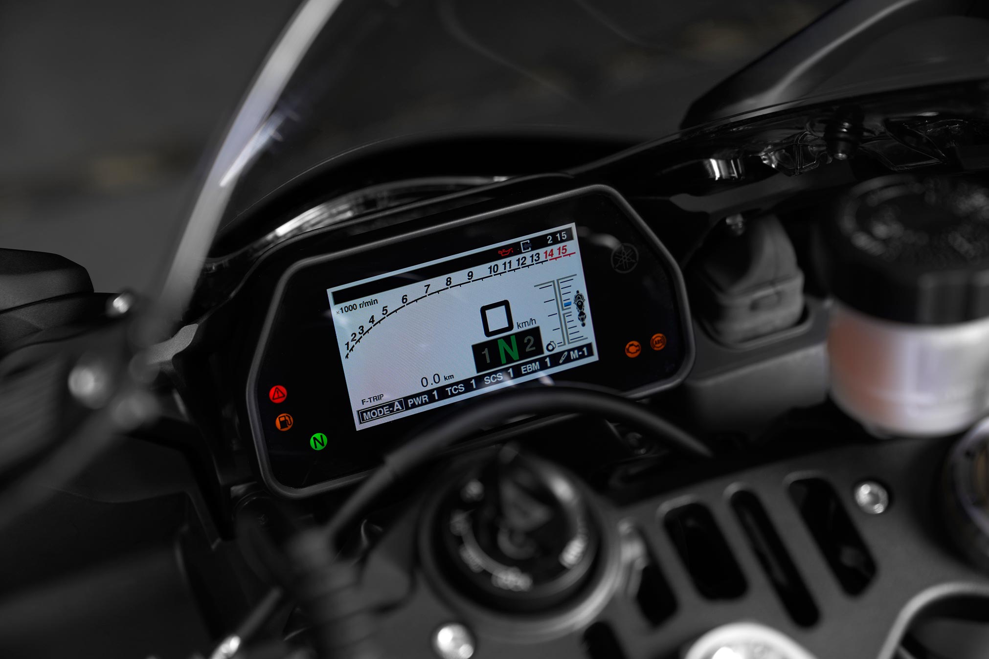 The R1M features a brilliant full-color, thin-film transistor (TFT) meter, including front brake pressure and fore/aft G-force readouts which gives the rider feedback from the machine. It features both street mode and a track mode that focuses on performance information, such as YRC settings (including EBM and BC systems), a zoomed-in view of the tachometer in the upper rpm range, a lap timer, gear position indicator and speed.