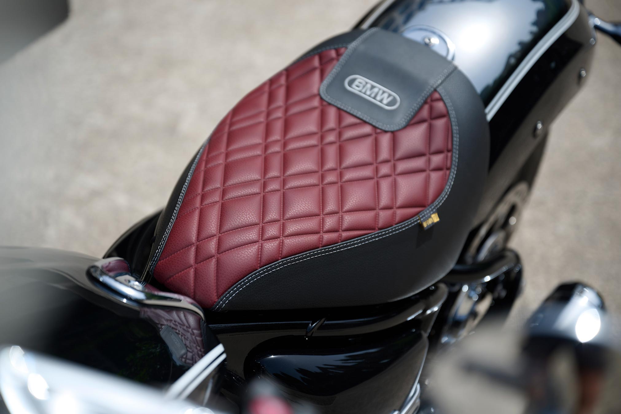 The unmistakable center piece of the R 18 100 Years is the 1,802 cc, 91 hp boxer motor, the largest displacement engine ever installed in a BMW motorcycle. Both technically and visually, the BMW R 18 borrows from famous BMW models such as the 1936 BMW R 5 and puts the focus back on the essentials of motorcycling: Purist and no-frills, with the boxer engine as the epicenter of the riding experience. The big boxer is complemented by numerous special features and details. The paint finish of the R 18 100 Years, like that of the anniversary model of the R nineT, is in Classic Chrome and thus combines black paintwork and high-gloss chrome surfaces as well as white double-pinstriping and a 100 Years badge. The paint-on-chrome Classic Chrome finish is also found on the rear fender in combination with white double-pinstriping. The front fender and the side covers are painted in black, complemented by white double-pinstriping on the front fender. The Option 719 seat is upholstered in the two-tone combination black/oxblood red and features diamond embossing.