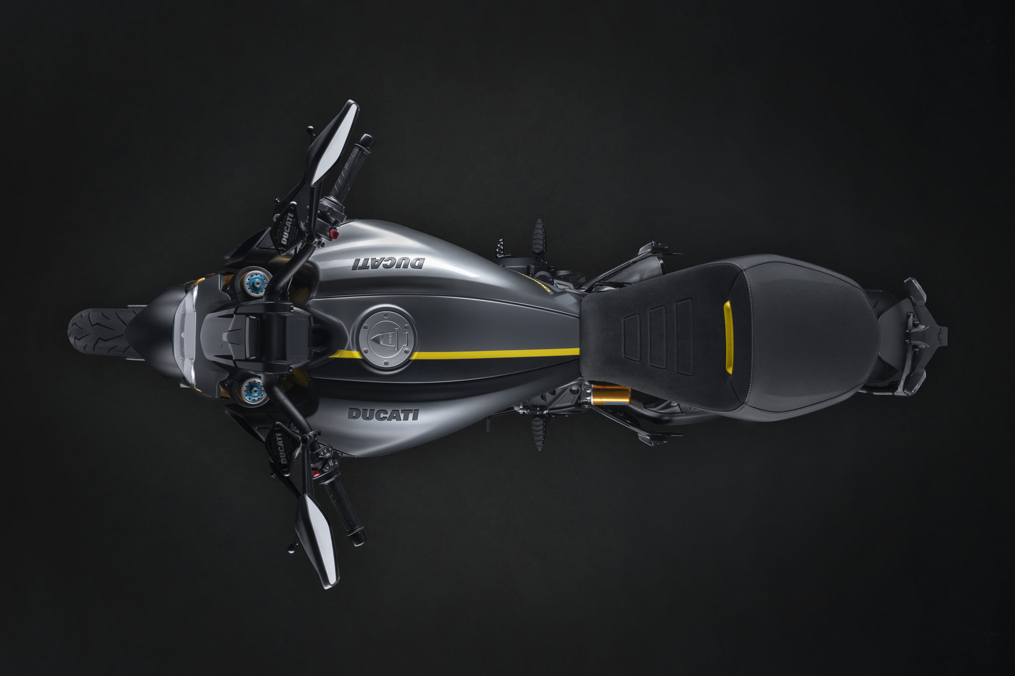 In turn, the Diavel 1260 S is fitted, for the first time ever, with a fully adjustable 48-mm diameter Öhlins fork and an Öhlins shock-absorber, also fully adjustable. Öhlins suspensions ensure not only an impeccable response in terms of bike dynamic performance, but also outstanding comfort on any type of terrain; moreover, they account for a truly precious-looking bike with their characteristic gold finish.