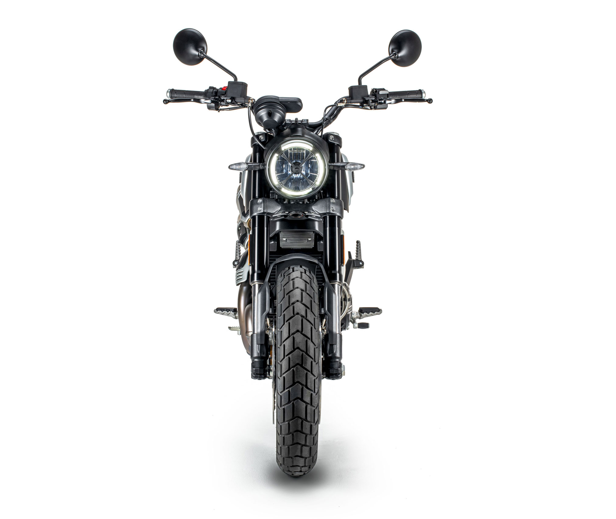 With the new Dark Stealth color, combined with the tubular steel frame and the aluminium rear frame, both in black. The rear is the most distinctive part of the bike thanks to the right side dual exhaust and the low number plate holder, which make an important contribution to making the bike compact.