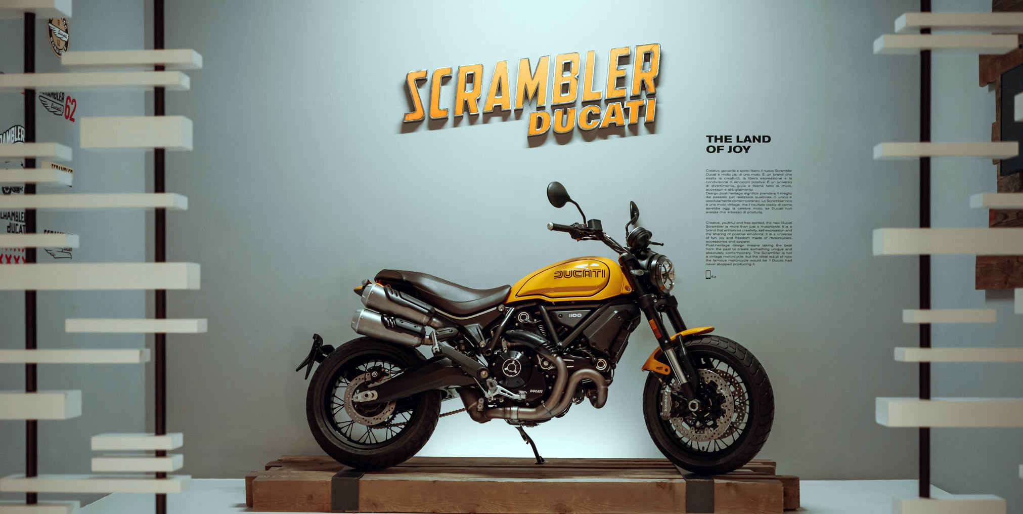 The Centro Stile Ducati was inspired by iconic Ducati elements of the 70s such as the special “Giallo Ocra” livery, the Ducati logo of the time and the black spoked wheels.