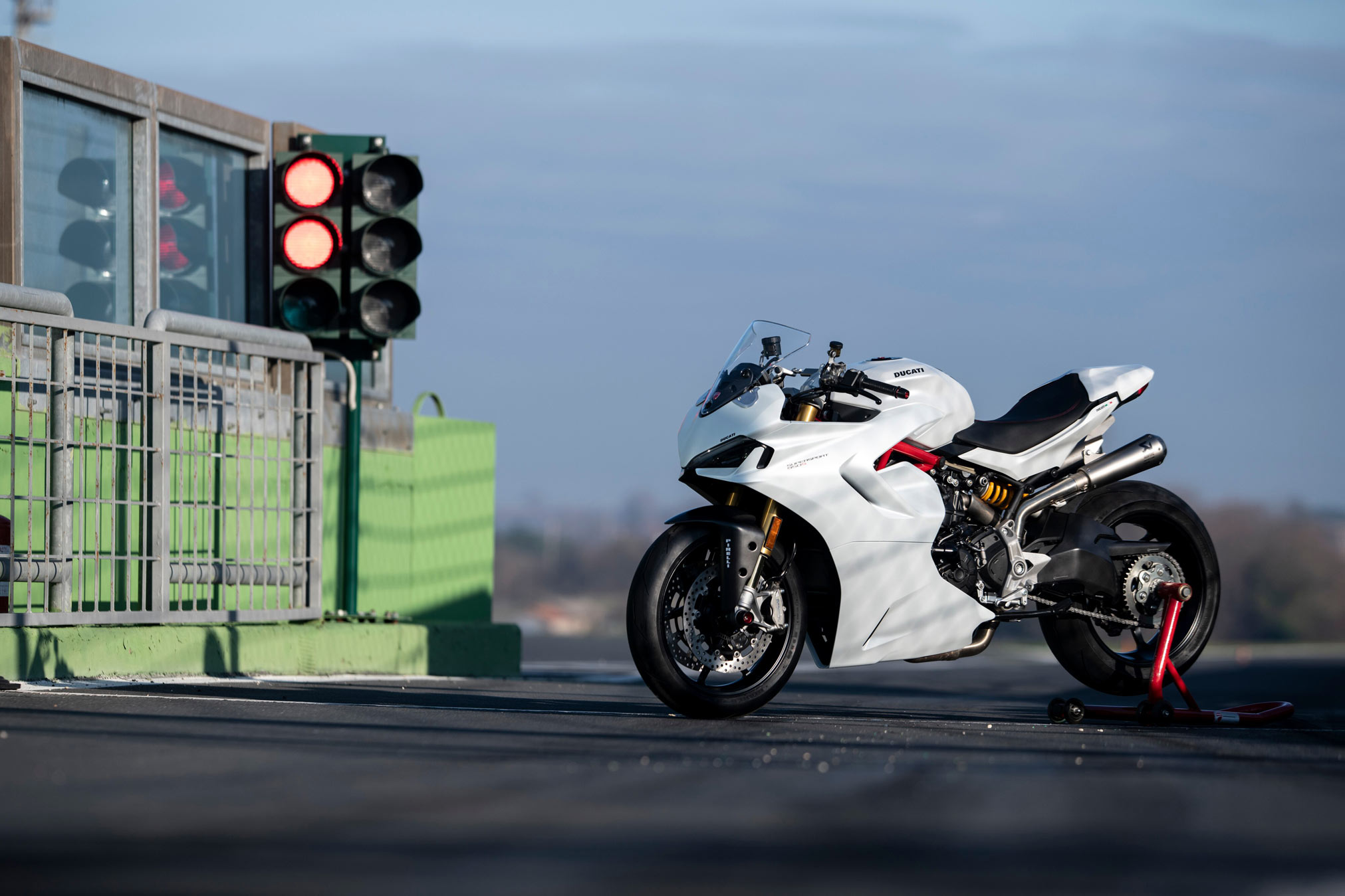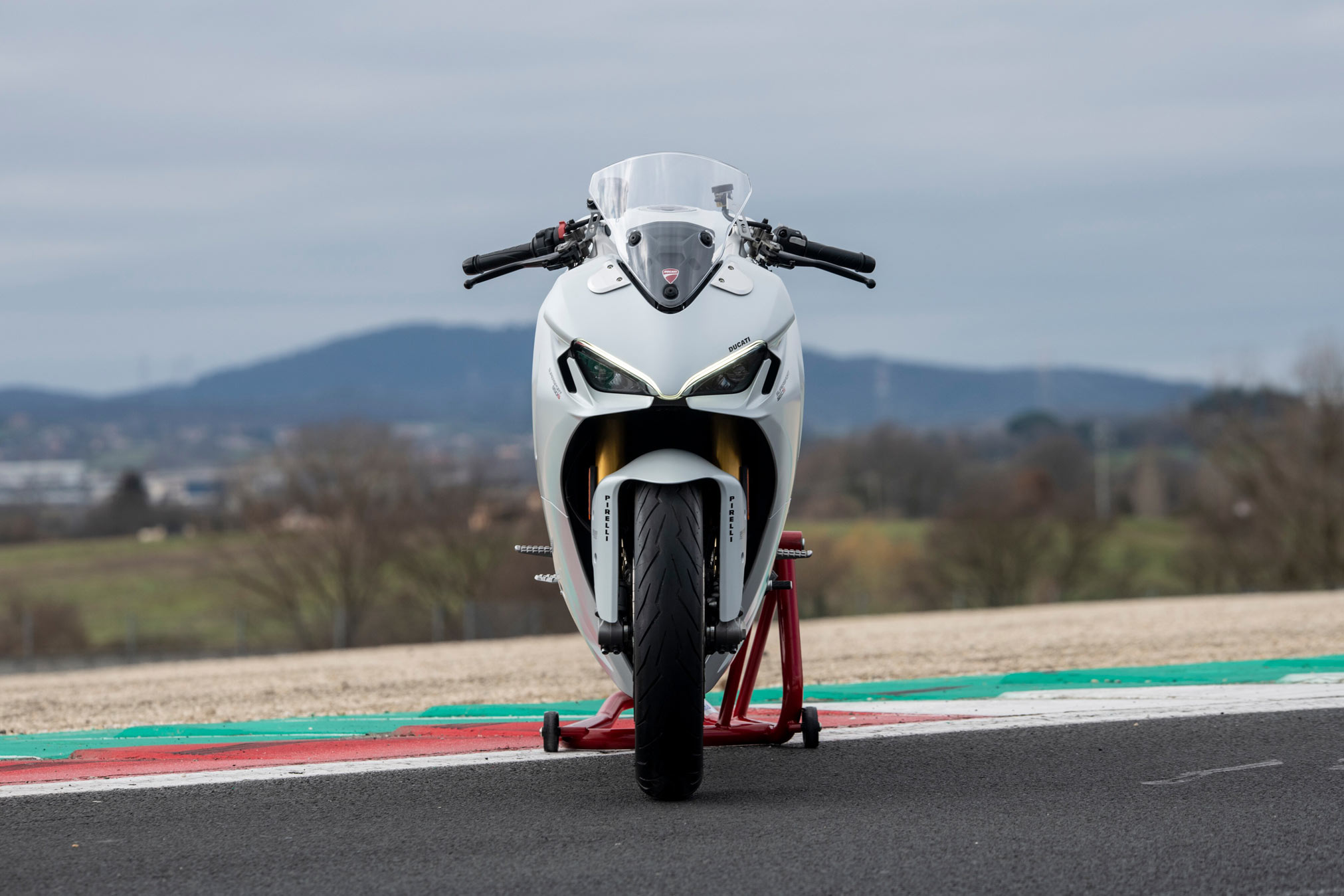 - Arctic White Silk fairing with Ducati Red frame and Glossy Black wheel rims with Ducati Red “tag”