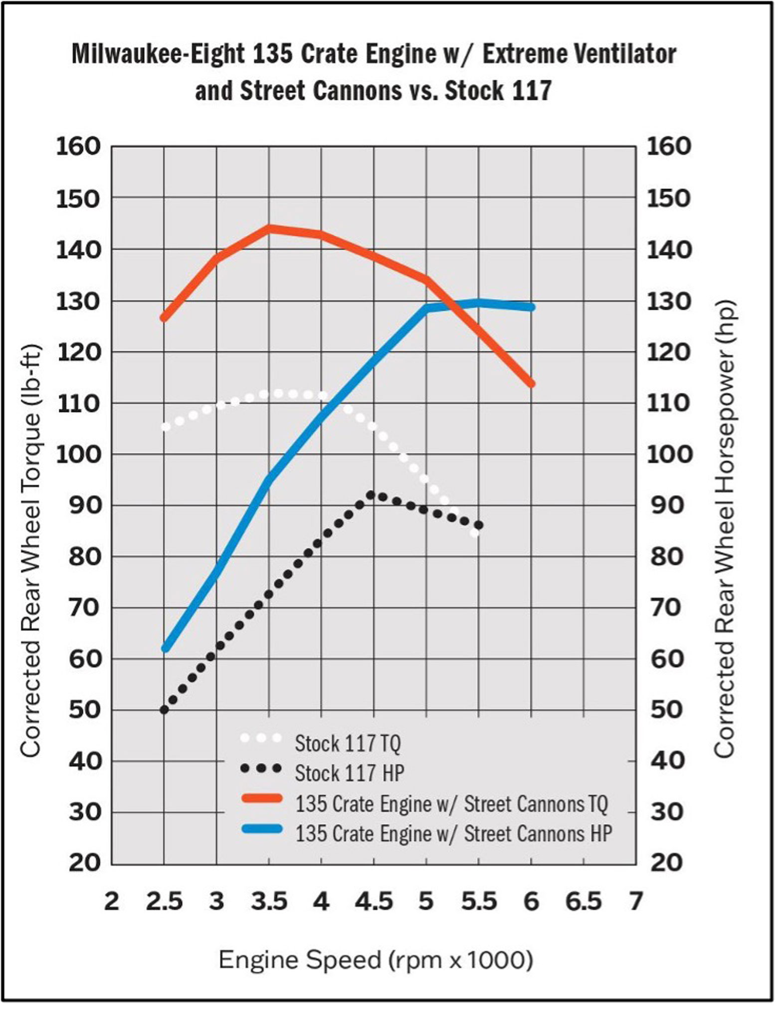 Engineered and tested as a complete collection of high-performance components and assembled from the bottom up at Harley-Davidson Powertrain Operations in Menomonee Falls, Wisconsin, this street-tuned 135-cubic-inch (2212cc) Screamin’ Eagle Crate Engine is designed to run with a wide-open throttle at high engine speeds and provide instant passing power from cruising speed. The engine delivers 143 lb.-ft. of rear-wheel torque at 3500 RPM and 130 rear-wheel horsepower at 5500 RPM – approximately 28 percent more torque and 41 percent more horsepower at the rear wheel than a production Milwaukee-Eight 117 engine.
