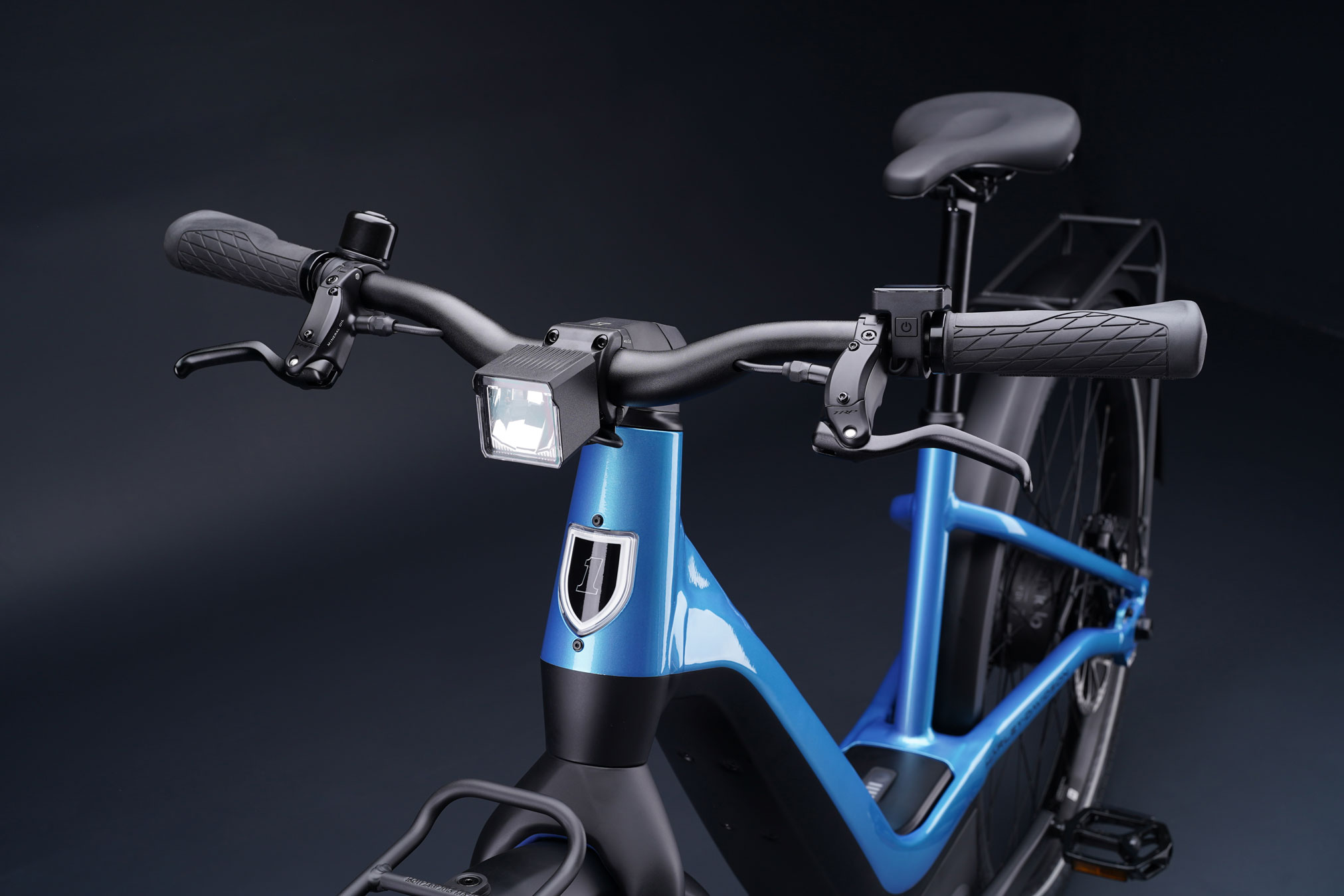 Handlebar Controls: Ergonomically arranged thumb-and-forefinger controls on all models allow the rider to turn the eBicycle on and off, change ride modes, switch the integrated headlight on and off, and engage walk-assist without lifting a hand off the handlebar.