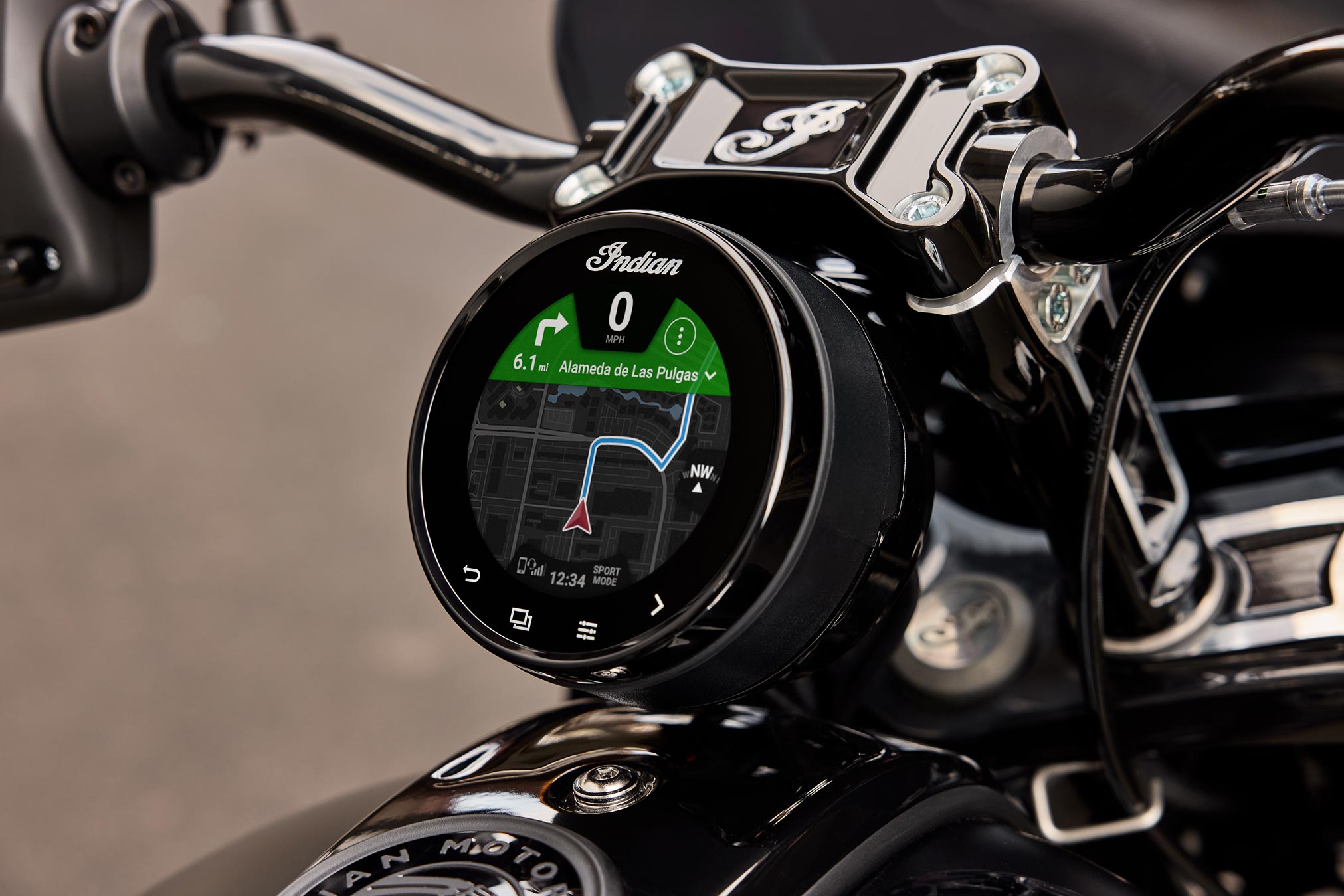 The 4-inch touchscreen maintains a classic aesthetic by disguising itself as an analog gauge. It provides turn-by-turn navigation with connected features like weather and traffic overlays, lets you control ride modes, answer and decline calls, and manage your music from any Bluetooth®-connected device.
