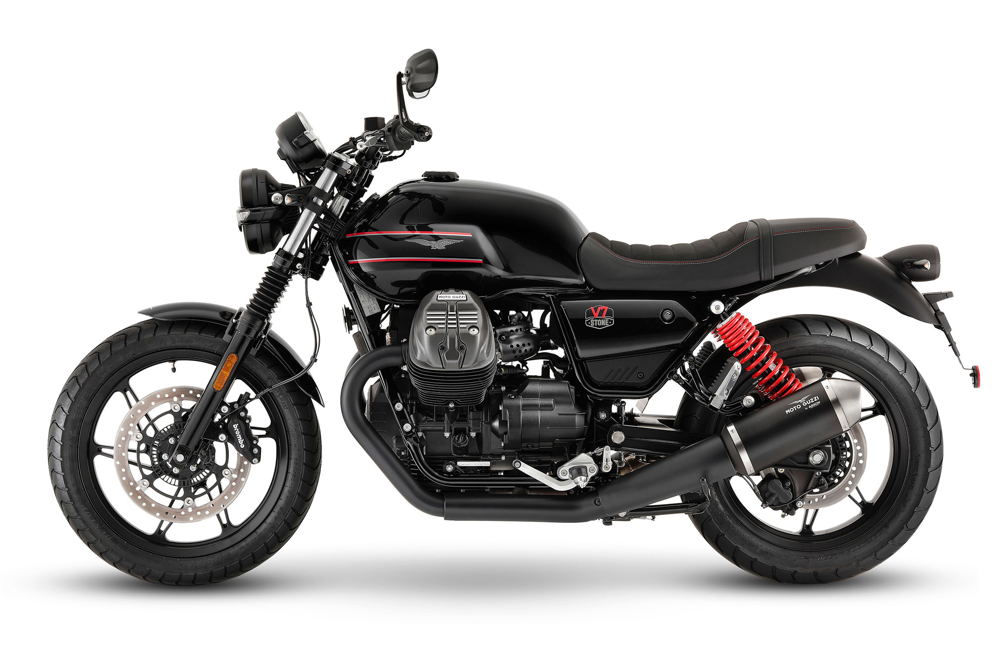 Less than two less years since the launch of the latest generation of V7, presented in spring 2021 and the object of huge commercial success, the new Moto Guzzi V7 Stone Special Edition will be unveiled at GMG – Giornate Mondiali Moto Guzzi. Decidedly dynamic, the Moto Guzzi V7 Stone Special Edition does away with the matte shades typical of the Stone version – the most contemporary of the V7 family – to flaunt a special Shining Black colour scheme, enhanced on the tank with graphics and red details that recall the style traits of the Eagle brand’s sportiest models. A sports attitude that is also highlighted by the red painted shock springs and the contrasting red stitching of the saddle, also specific to this unique model. A plate on the handlebar riser identifies its special edition status.