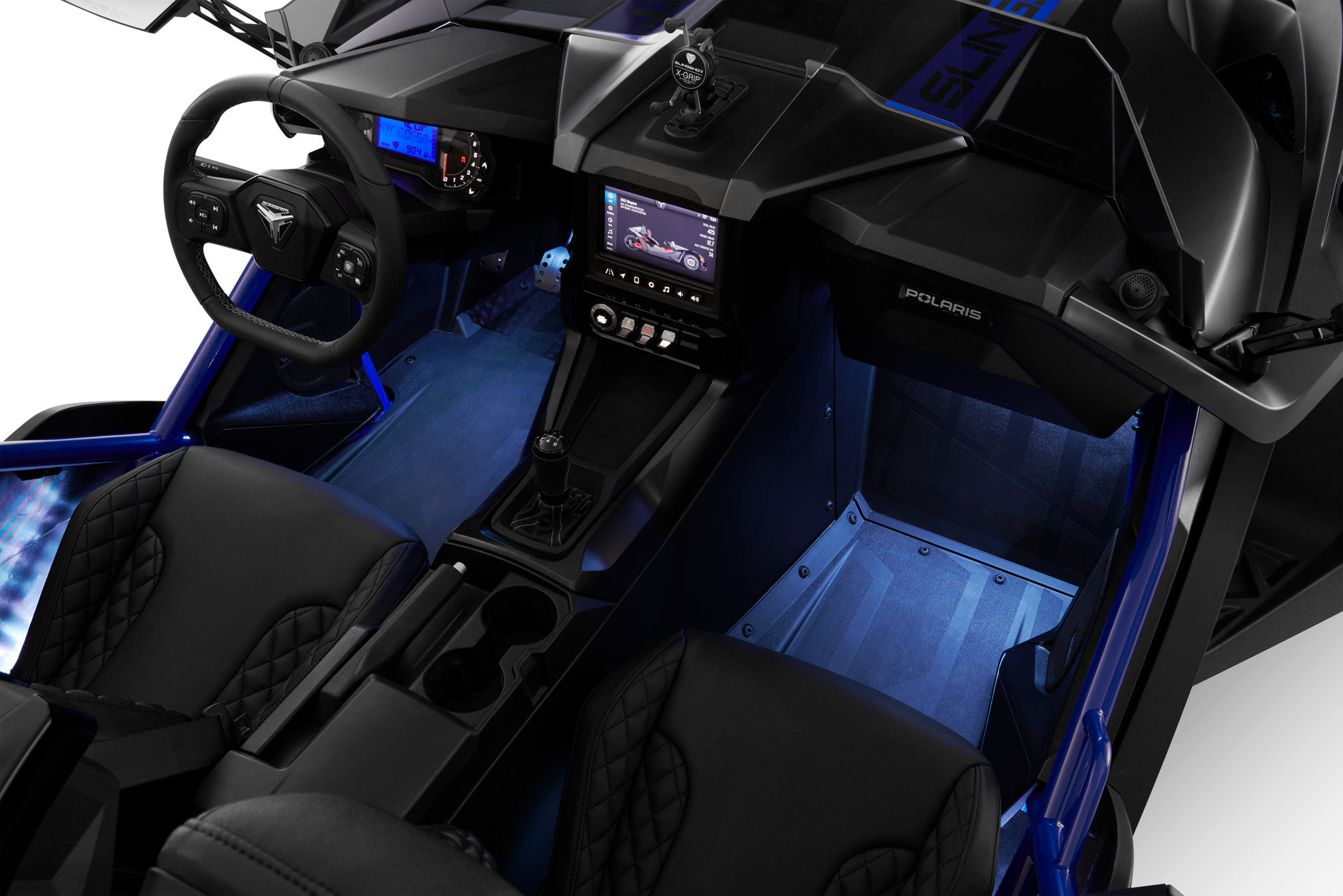 With the Interior LED Lighting by XKGlow, drivers can now flaunt their true colors and match their driving mood by synchronizing the interior lights to change with their music through an exclusive Slingshot app. The lights include the full red, green, and blue color light spectrum for total customization.