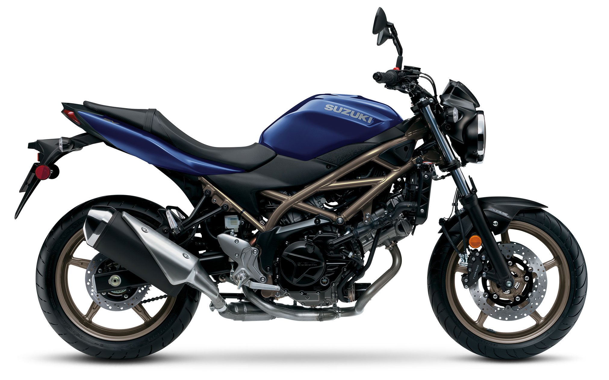 The 2023 SV650 ABS’s Metallic Reflective Blue bodywork is accompanied by a frame and wheels coated with dark-gold metallic paint.