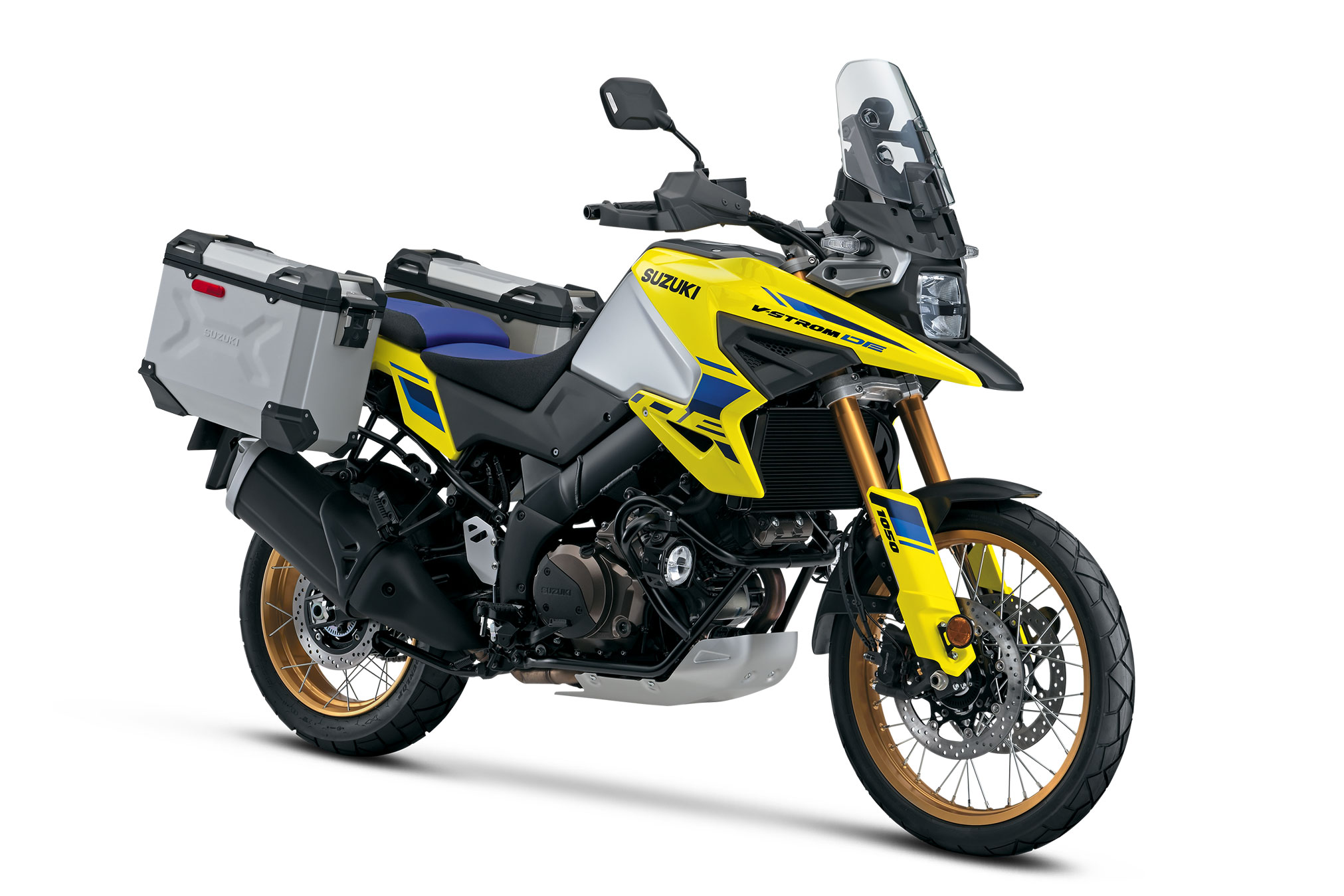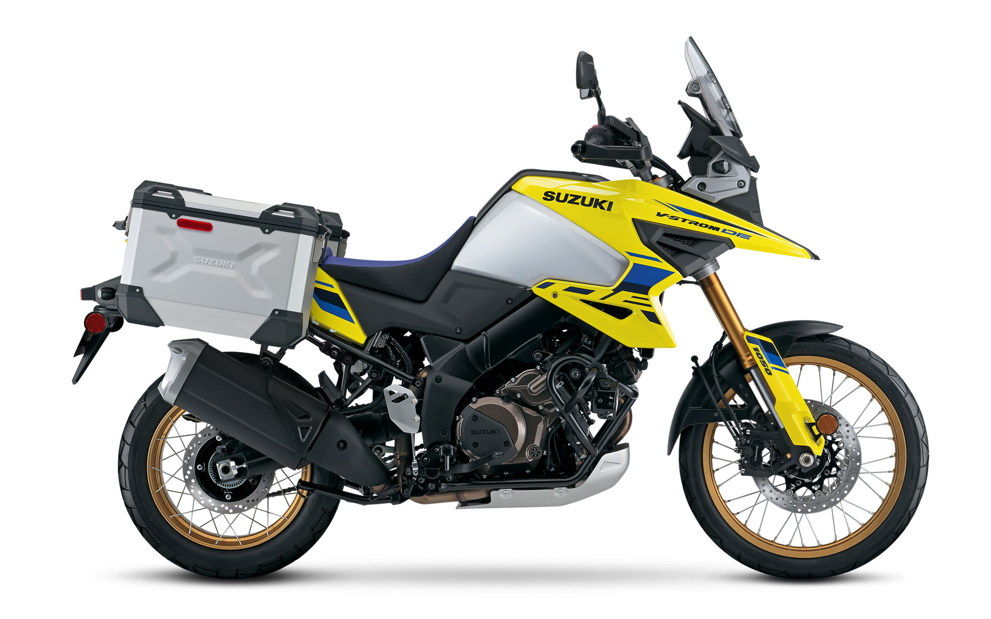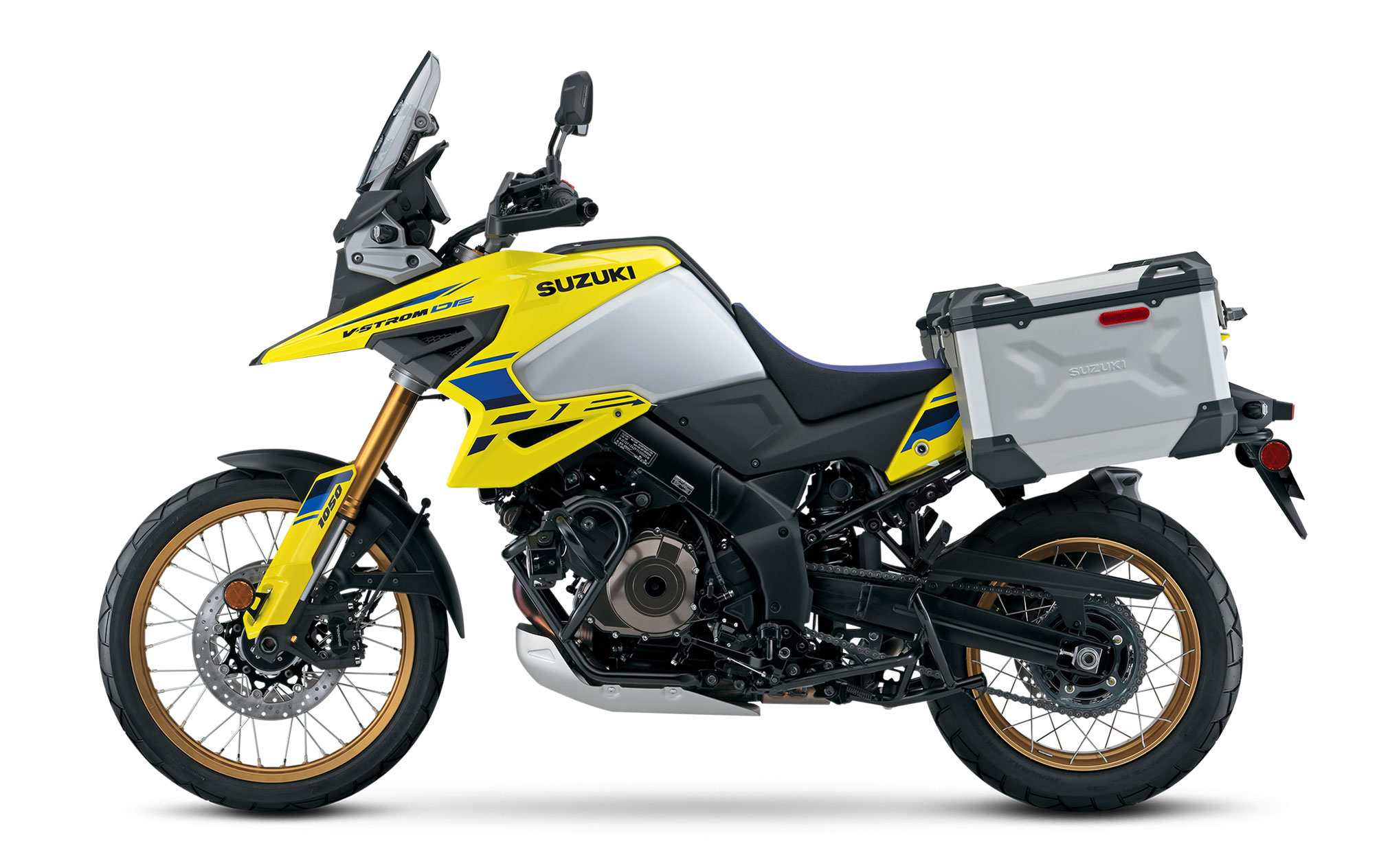 Included are Suzuki’s ADV-style, 37-liter aluminum panniers that attach to powder-coated, stainless-steel carriers.