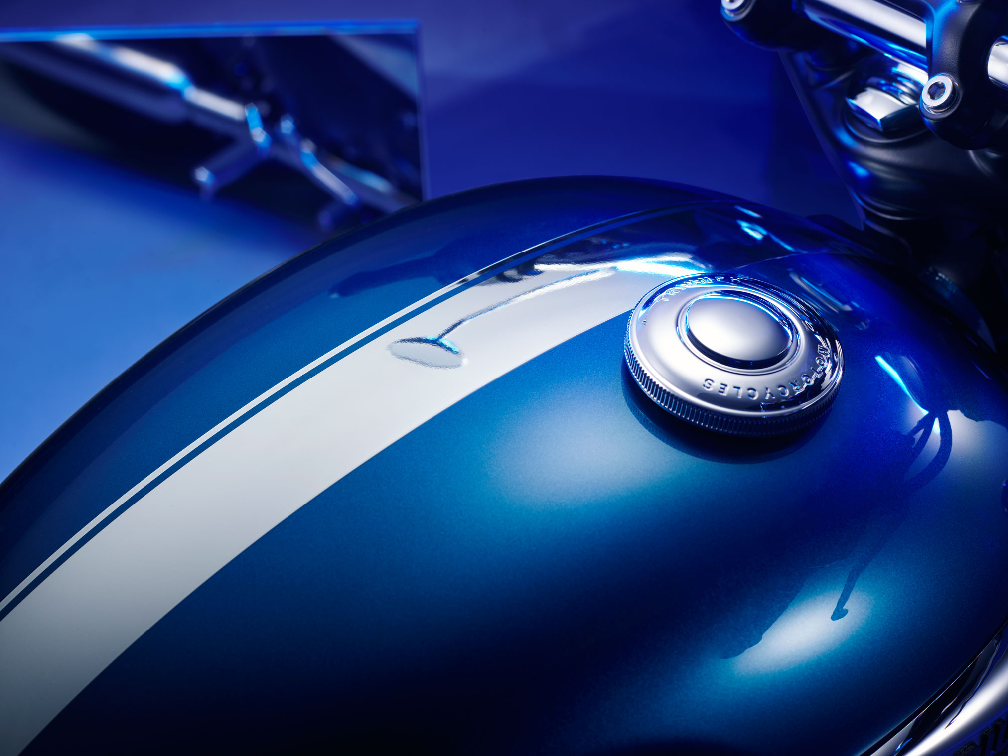 The Bonneville T100 Chrome Edition features a contemporary Cobalt Blue fuel tank with unique Chrome Edition metal stripe detailing. And, complementing this stunning centerpiece, the mudguards, side panels and headlamp bowl are all finished in rich Jet Black. To add even more practicality and custom style, a matching Cobalt Blue fly screen is available as an accessory option, which also features in the Bonneville T100 Chrome Edition Accessory Kit.