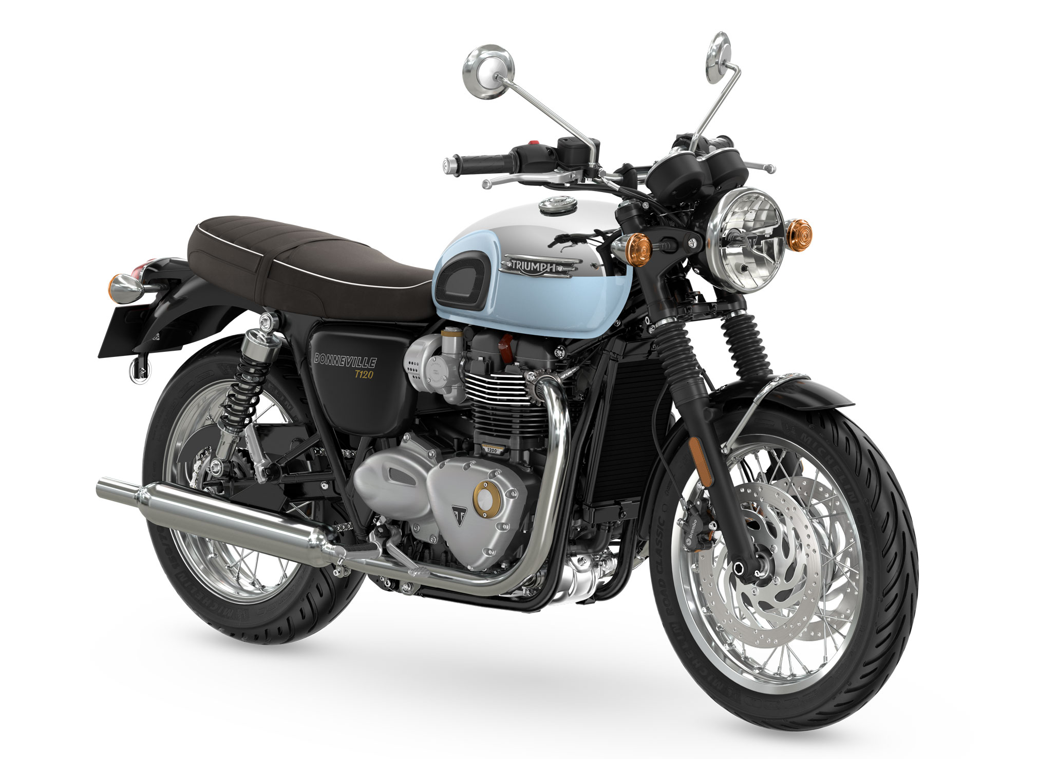 For model year 2023, the legendary Bonneville T120 comes in three colours, with a stylish Triumph Jet Black, and a sophisticated Cordovan Red and Silver Ice scheme, plus a stunning new Aegean Blue and Fusion White option, with hand-painted gold line detailing on the tank. The new heritage-inspired colour scheme also features Aegean Blue mudguards, and Jet Black side panels and headlight bowl.
