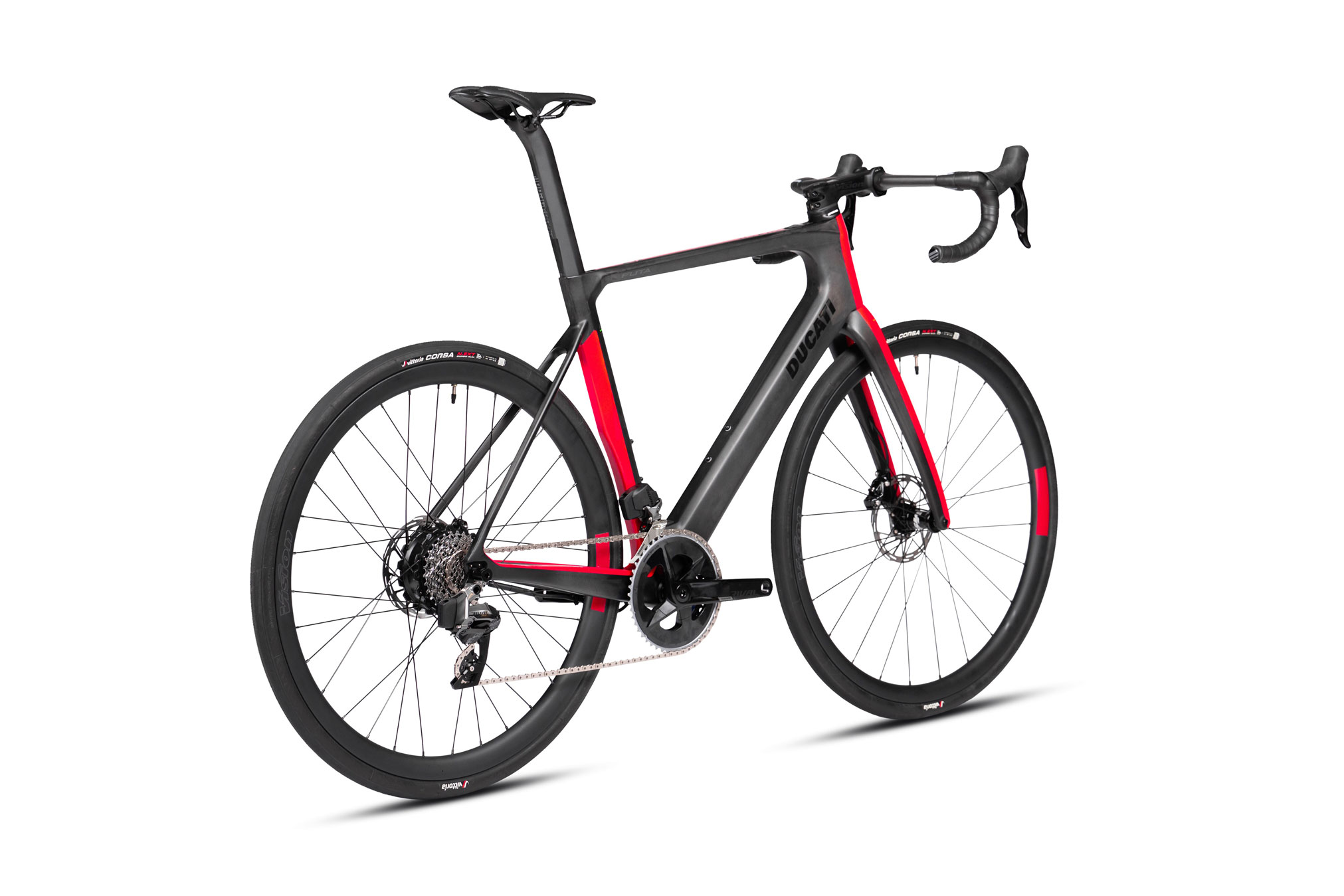 The compact rear stay, with lowered sheaths, makes the bike comfortable, while generating less aerodynamic drag. The rear triangle is rigid laterally, precisely by virtue of the choice of the position of the sheaths and favours a better transmission of power to the wheel, as well as increasing the responsiveness of the bike. Down tube, seat post and fork sliders are expertly profiled and their reliefs are highlighted by the play of colors of the livery which sees grey and black as the main colors with accents in Ducati Red.