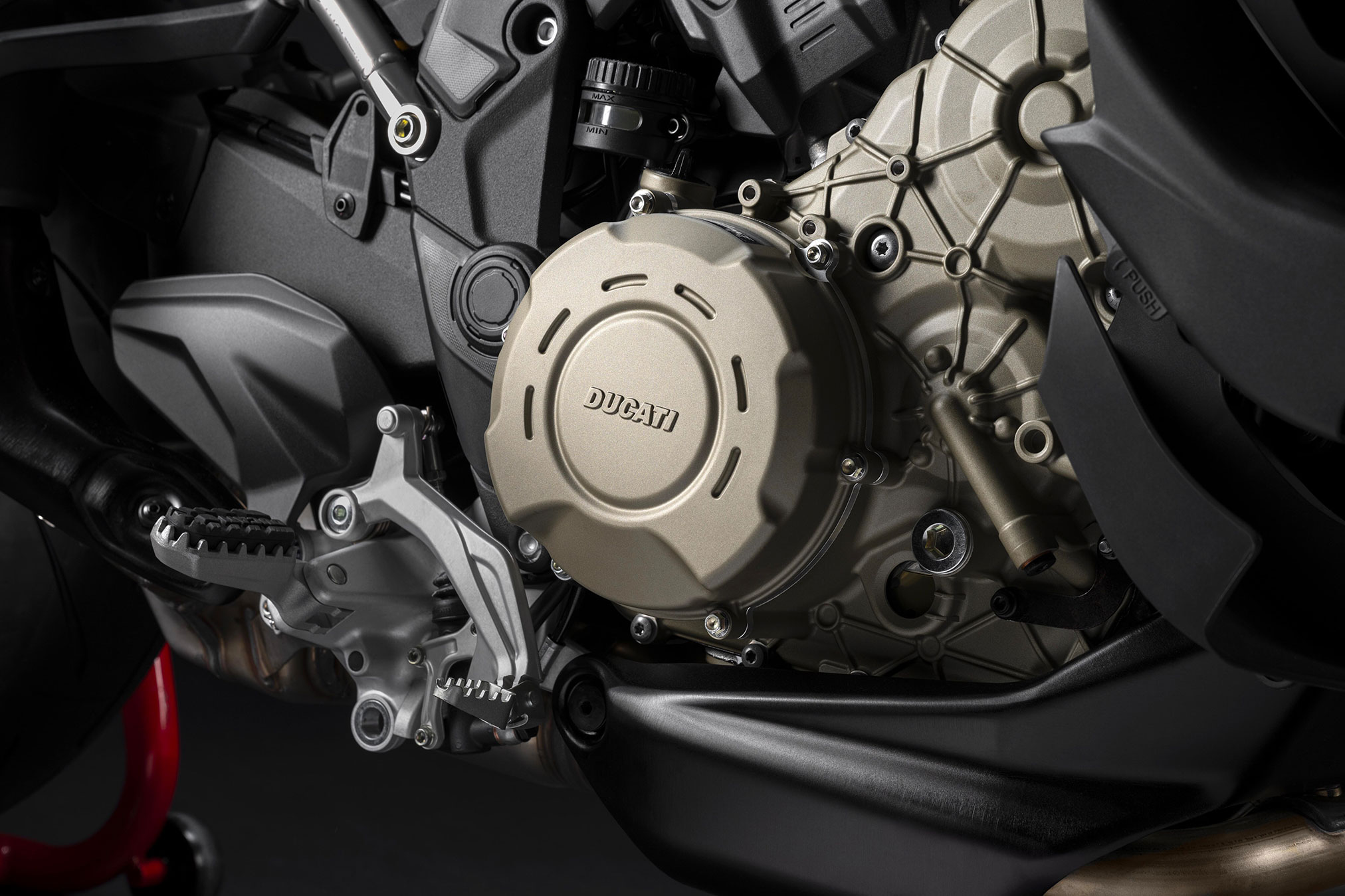 Multistrada V4 RS mounts the STM EVO-SBK dry clutch in billet aluminium. This component ensures a smoother ride when braking and shifting and heightens the excitement with its distinctive sound.