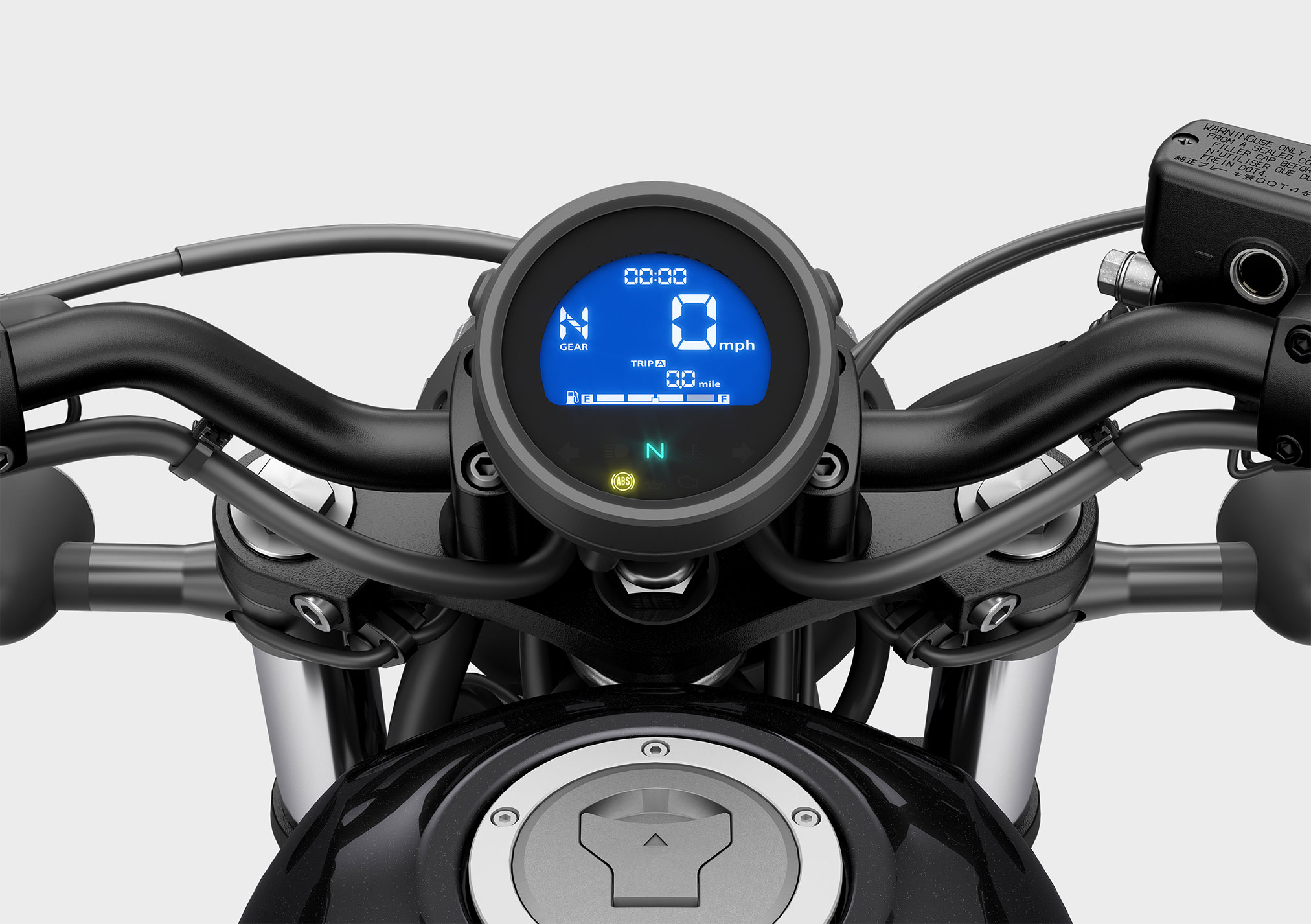 Another iconic element combining traditional and new, the Rebel’s instruments take a classic shape and fill it with totally up-to-date digital LCD information. The instruments include a gear-position indicator and a fuel-consumption display.