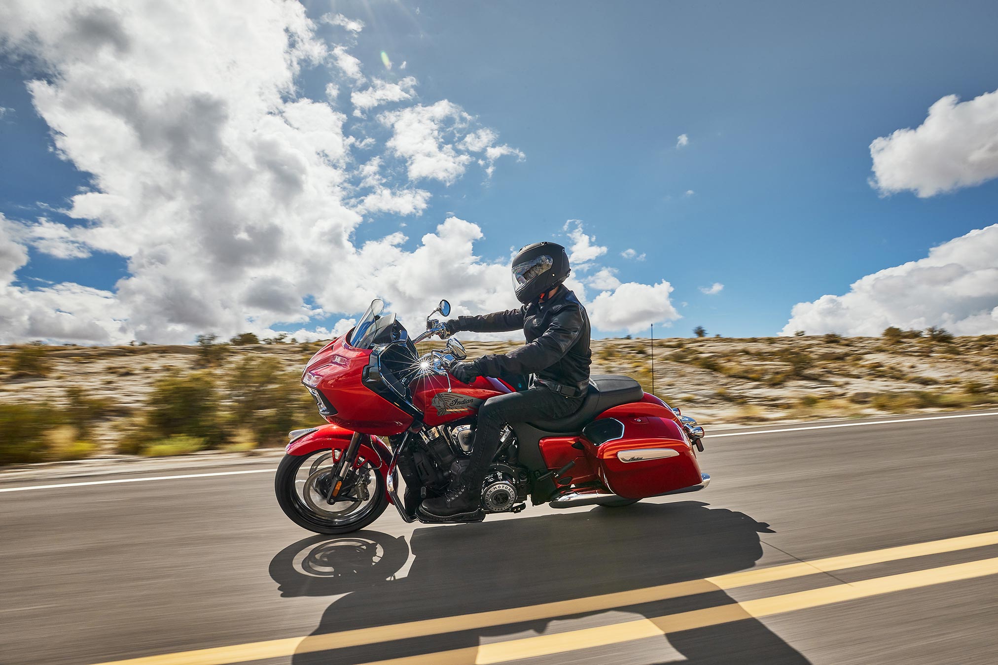 MINNEAPOLIS, MN – November 7, 2023 – Indian Motorcycle, America’s First Motorcycle Company, today announced a brand collaboration with the popular American motocross brand 100%, along with its full 2024 model year lineup. Highlighted by a limited-edition FTR x 100% R Carbon, the 2024 lineup features a new Indian Challenger Elite, a completely redesigned PowerBand Audio system, and updates across the entire Indian Motorcycle lineup.