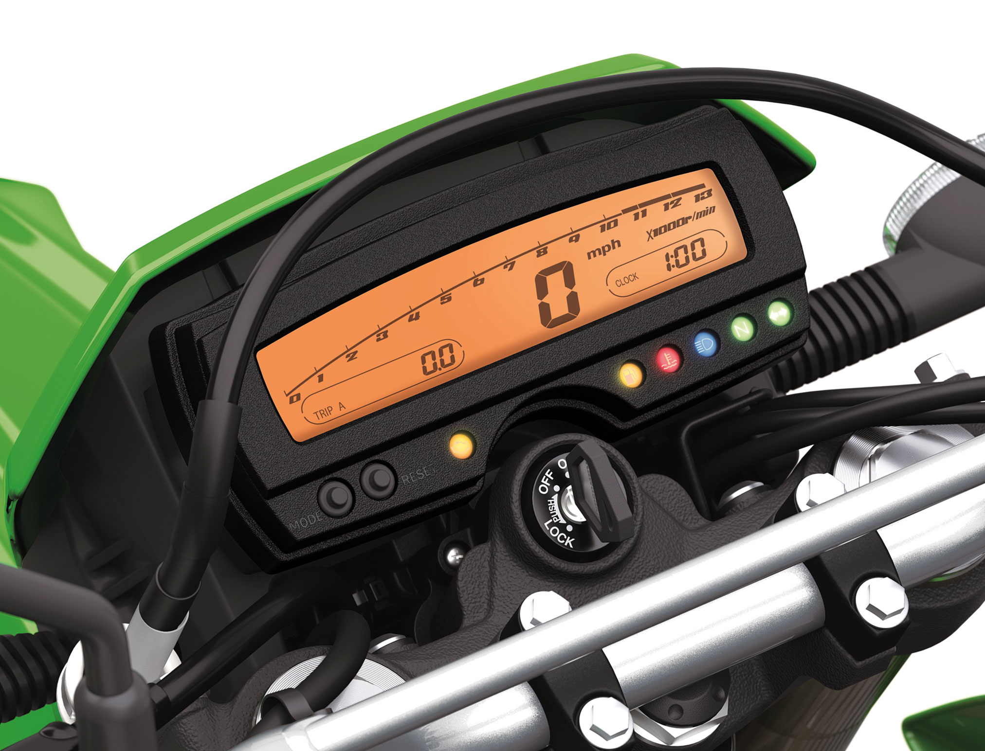 With all-new styling and bodywork, the KLX300 and KLX300SM feature a sharp design that flawlessly flows from the front fender to the tail. Including a compact new LED headlamp condensed rear fender, and all-new KX-inspired styling, the latest KLX is sure to turn heads on the dirt or the pavement.