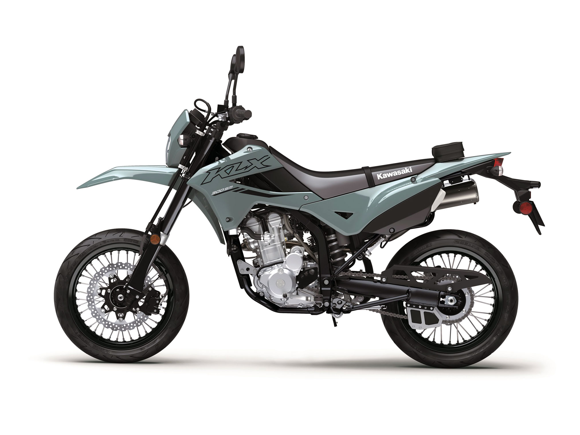 The class-leading KLX300SM lightweight supermoto motorcycle takes the fun to the streets in full supermoto style. A quick-accelerating engine, paired with light, agile handling, evokes the playfulness within. Suspension, wheels, and brakes are optimized for supermoto, and the overall aggressive styling means business. All-new Kawasaki KXTM motocross-inspired styling gives the KLX300SM a bold new appearance that brings the KX championship winning heritage to the streets.