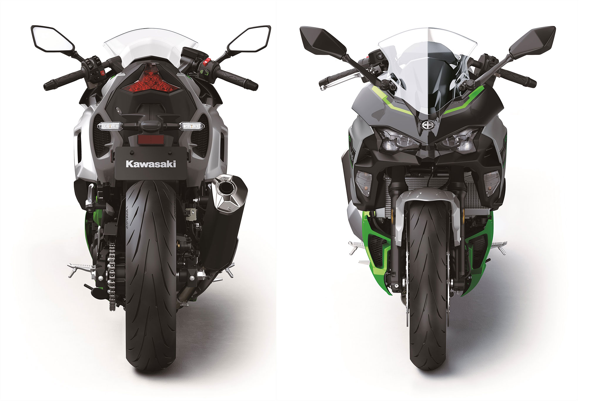 The design extends to the rear with elegant lines of the tail cowl that envelop the bike and add a modern touch. The LED taillight, inspired by the Ninja® ZX™-10R sportbike, gives the rear a sharp impression, complemented by LED turn signals and a license plate bulb to complete the all-LED lighting package. The color and graphics of Silver and Lime Green, with a semi-matte finish, contribute to a fresh and futuristic image for Kawasaki’s HEV models, enhancing the overall visual appeal of the Ninja 7 Hybrid ABS. From front to rear, the motorcycle exudes a sense of innovation and sportiness, inviting riders to experience the future of hybrid motorcycles with style.