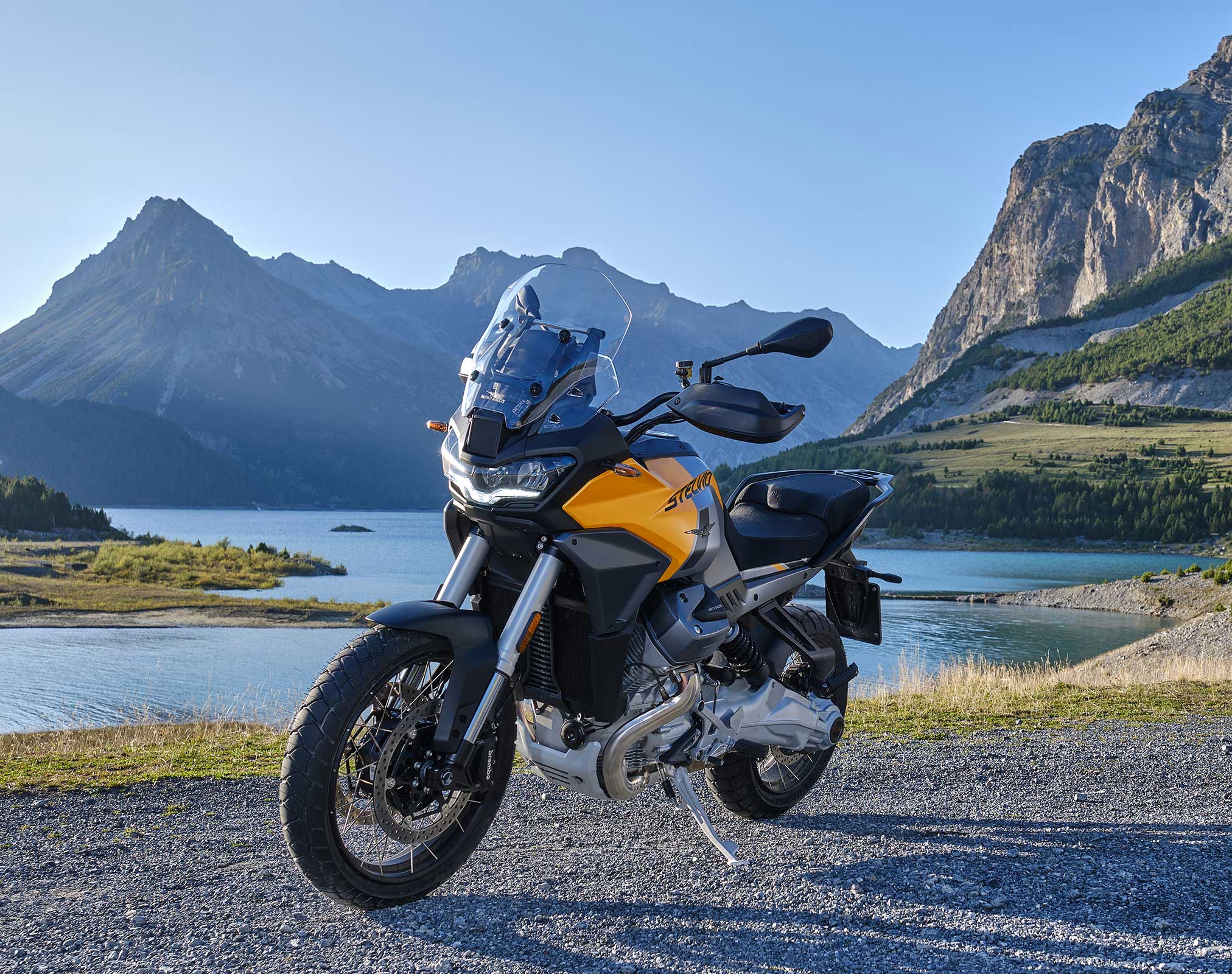 - STELVIO, WITH ITS BOLD PERSONALITY, REDEFINES THE ON-OFF ROAD EXPERIENCE. IT’S BUILT ON MOTO GUZZI’S MOST ADVANCED TECHNICAL FOUNDATION, BOASTING A COMPACT TWIN-CYLINDER ENGINE THAT LEADS THE PACK IN PERFORMANCE. ITS INNOVATIVE TECHNOLOGIES ARE DESIGNED TO ENHANCE BOTH THE JOY OF RIDING AND SAFETY.