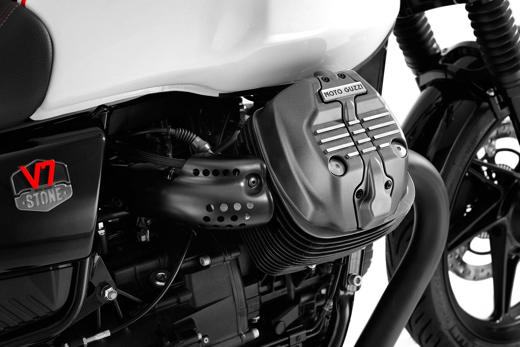 Engine The transversal 90° V engine, a true Moto Guzzi signature, guarantees excellent performance with substantial torque right from low revs. Thanks to the exhaust system by Arrow, standard on V7 Stone Ten, maximum power and torque rise respectively to 49 kW (66.5 HP) at 6700 rpm
