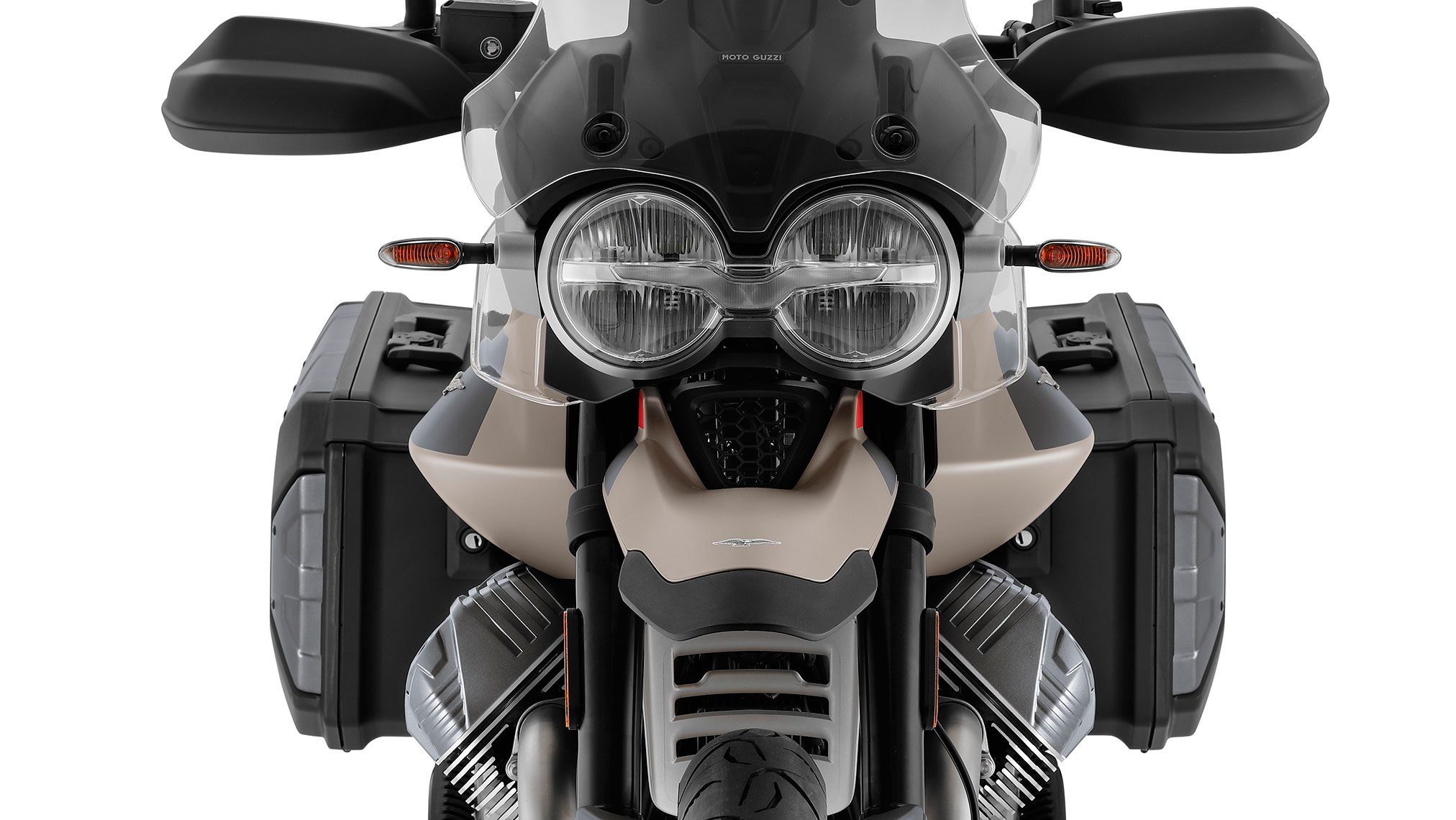 The front is, as always, characterized by the double circular headlamp, which includes the LED light cluster with the DRL outlining the silhouette of the Moto Guzzi eagle. The headlamp and instrument panel supports are now molded in die-cast aluminum, in place of the steel tube trellis of the previous generation, giving the top fairing a more sporting and dynamic presence. Continuing the stylistic theme from the front, the newly introduced rear grab handle (offered as an accessory for the V85 Strada) is also made of aluminum. This refined choice contributes to improved passenger comfort and ergonomics.