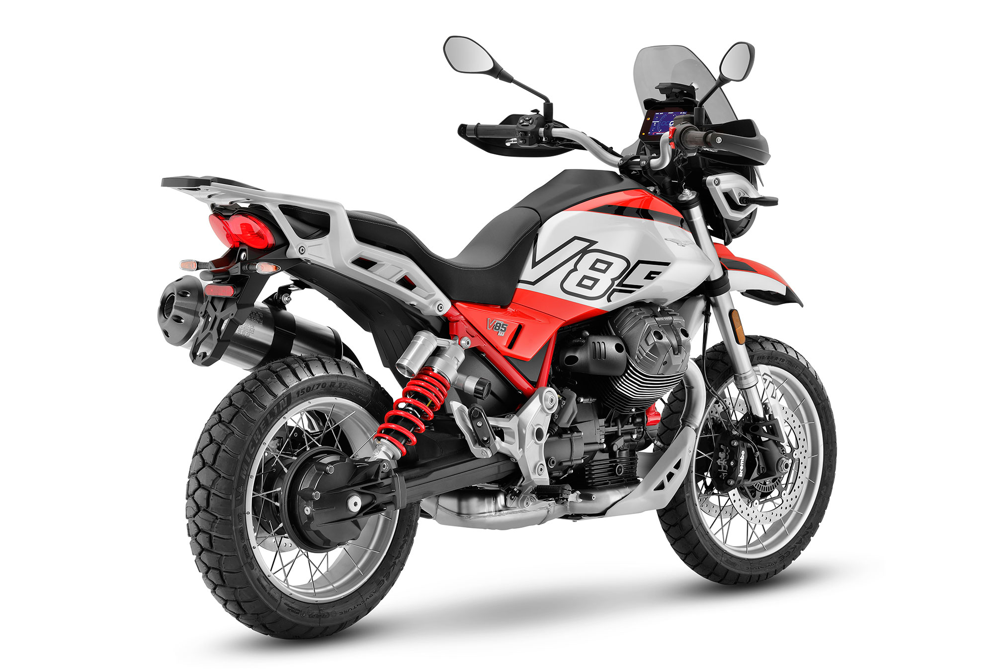 The Moto Guzzi V85 TT stands out for its red painted frame, combined with the evocative two-tone Rosso Fuji and Grigio Tambora livery. Even the rear shock absorber spring is red and can be easily adjusted for preload using a convenient knob.