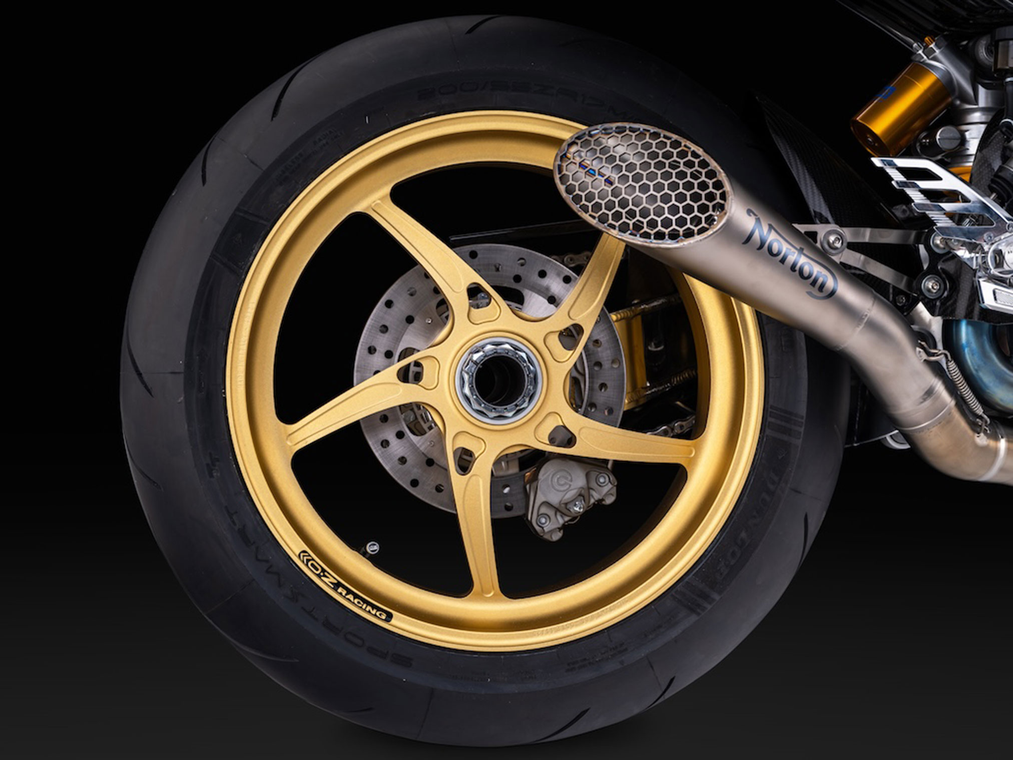 Norton 72-degree liquid-cooled 1200cc V4. Chain-driven cams with idler gear for reduced engine height. Titanium inlet valves. Slipper clutch
