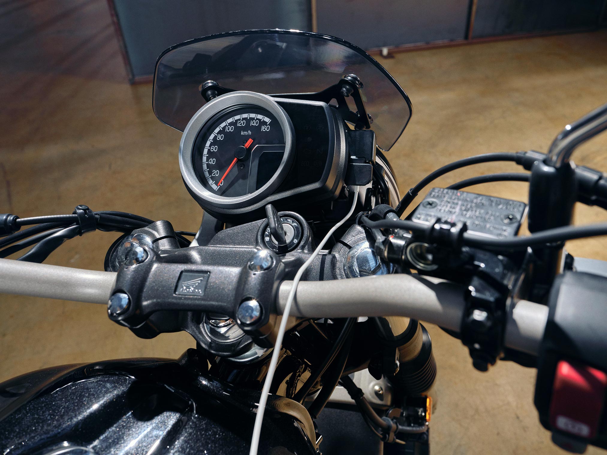 Deliberately understated styling pays homage to Honda’s illustrious roadster history with steel fuel tank, resin side panels and front mudguard, and stylish blacked out detailing on the engine and cycle parts. All lighting is LED, led by a circular headlight, while a compact analogue speedometer is at the centre of an attractive instrument display.