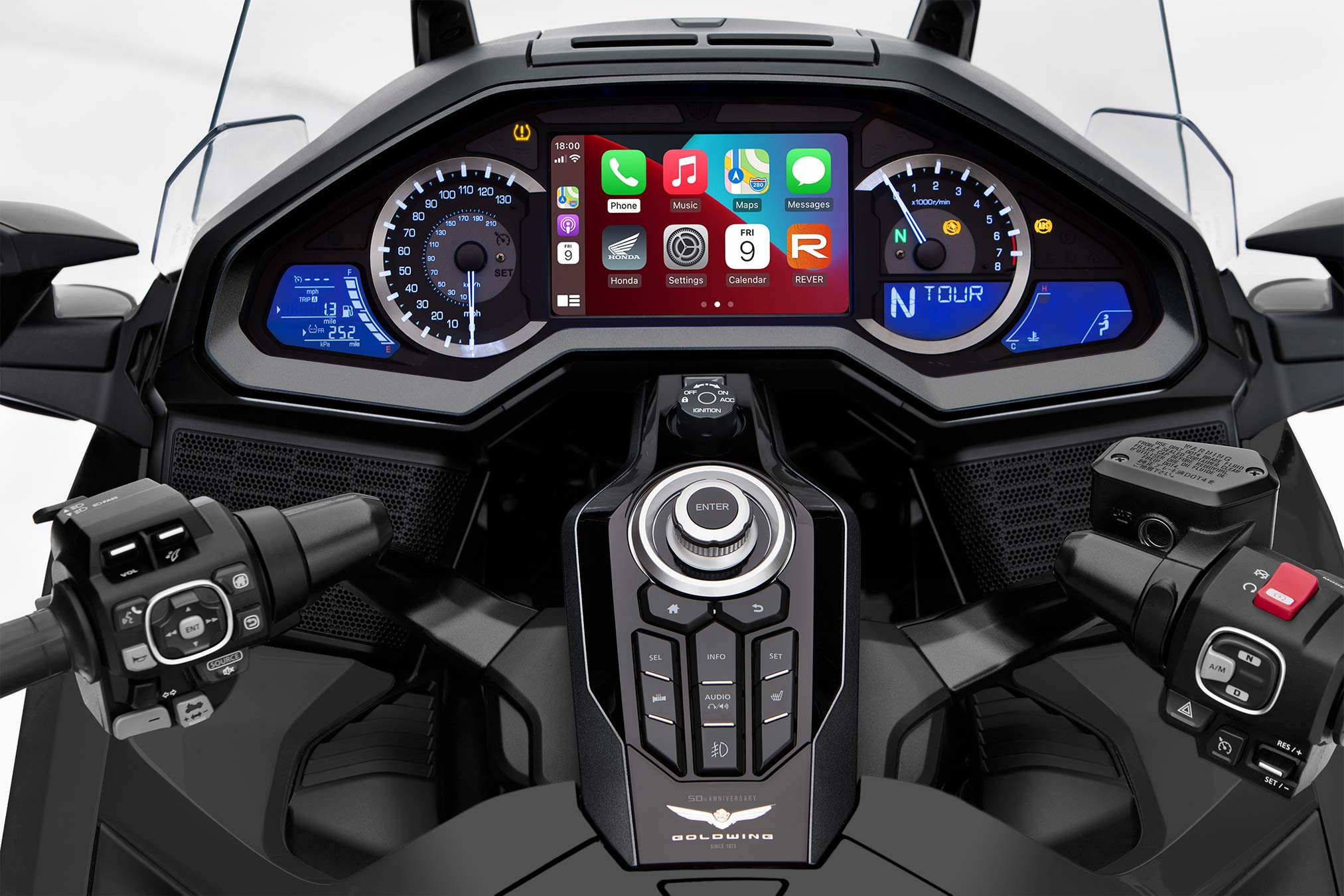 New for 2025, both Apple CarPlay and Android Auto can be used wirelessly on the Gold Wing platform.