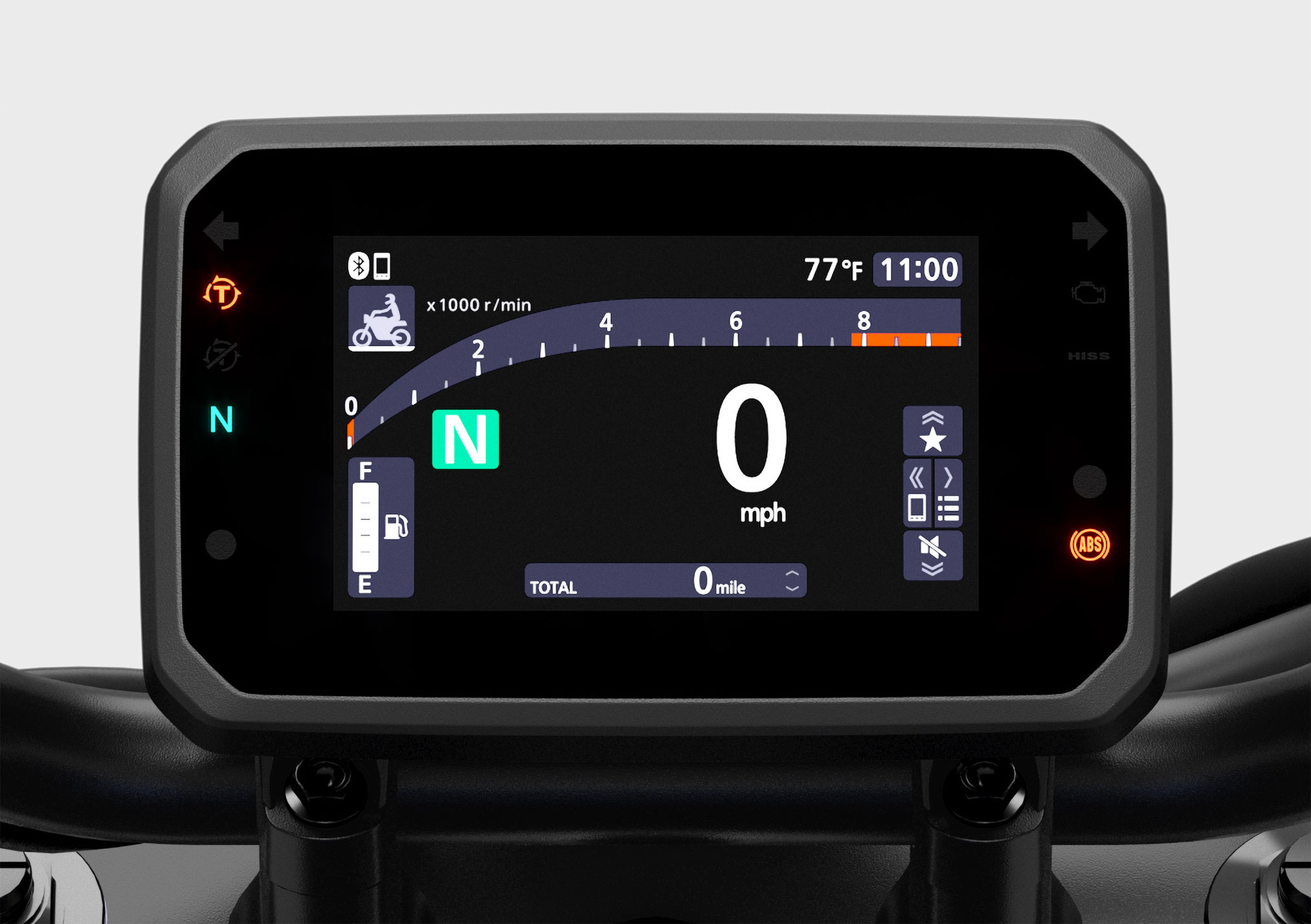Of course the big, bright five-inch Thin Film Transistor display gives you all the typical instrument information you want (speedometer, tachometer, time, fuel level, etc.) in a selectable format. But with our new Honda RoadSync app, you can also display music, phone and navigation functions.