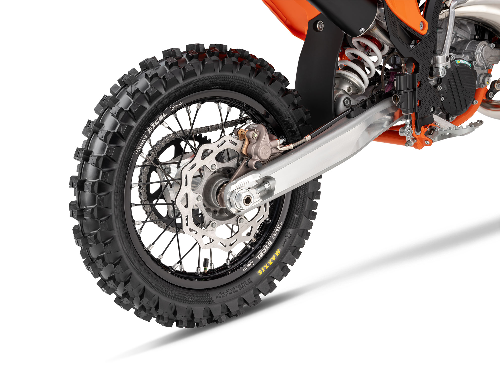Keeping the 2025 KTM 85 SX tracking is a set of Black Excel-branded rims and CNC machined hubs fitted with MAXXIS MAXXCROSS MX-ST tires. Not only does this combination deliver outstanding performance on a variety of terrain, but the pattern design and rubber compound deliver exceptional straight-line stability and excellent traction. As always, the KTM 85 SX is available for order with two rims sizes -19/16 and 17/14.