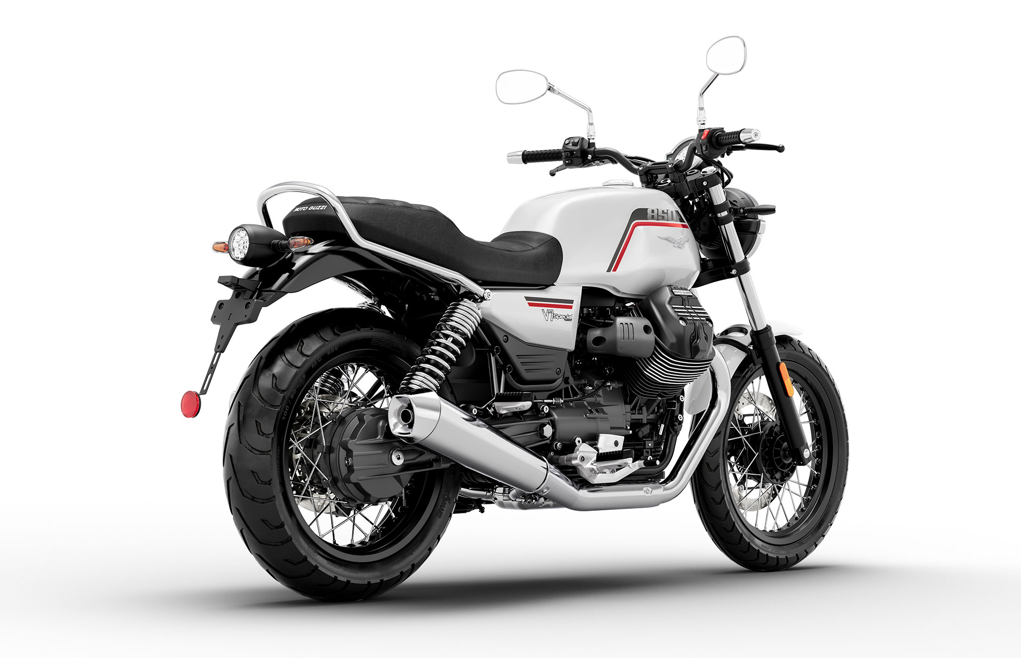 Moto Guzzi V7 Special features elegant chrome details and comes in two glossy variants: Nero Smeraldo black and Bianco 1969 white. The spoked wheels with polished rims and black hubs evoke a traditional aesthetic, while the single circular digital instrument and LED front headlight, framed to create the Moto Guzzi eagle outline, bring a contemporary edge. Notable design features include the milled cooling fins on the cylinders and a custom black seat.