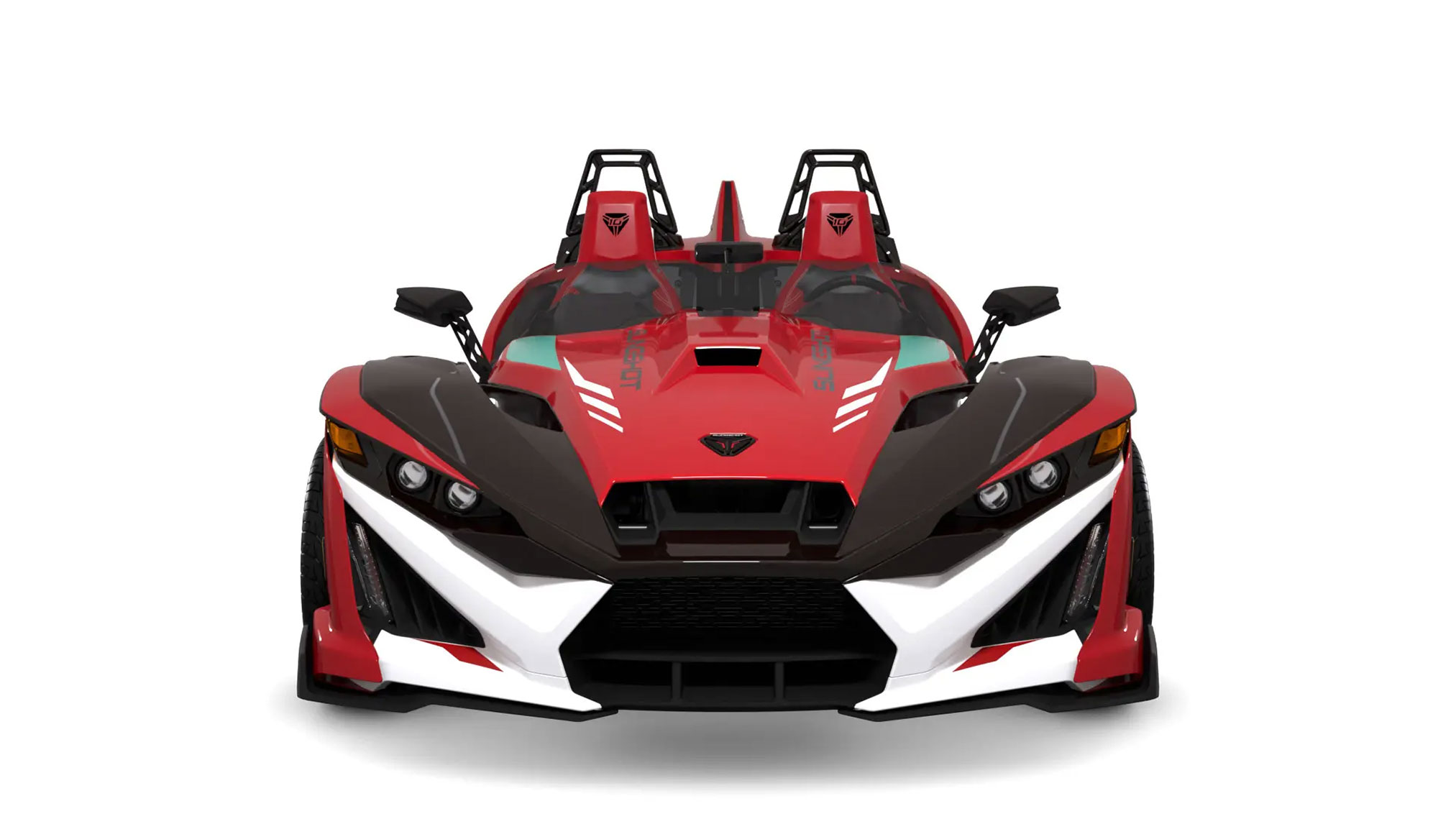 - Front-end view of a 2025 Polaris Slingshot 10 in the Radiant Red Pearl colorway.