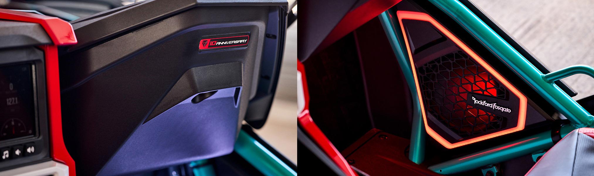 To celebrate a decade on the open road, the limited-edition Slingshot 10 embodies exceptional style and is guaranteed to catch every eye. It’s a high-performance 204 HP machine equipped with all of the R features including Brembo Brakes, RIDE COMMAND+ & Apple CarPlay, and a Vented Sport Hood, that make this model the best of the best. To take it next level, this model celebrates 10 years in style with exclusive 10th Anniversary branding throughout, a special edition paint scheme with a ghosted logo pattern, app controlled XK Glow lighting, special edition Heated & Cooled Seats, roll hoop audio, and the new 8” speakers with multi-color lighting. Celebrate Slingshot history with an exclusive ride that demands all the attention.