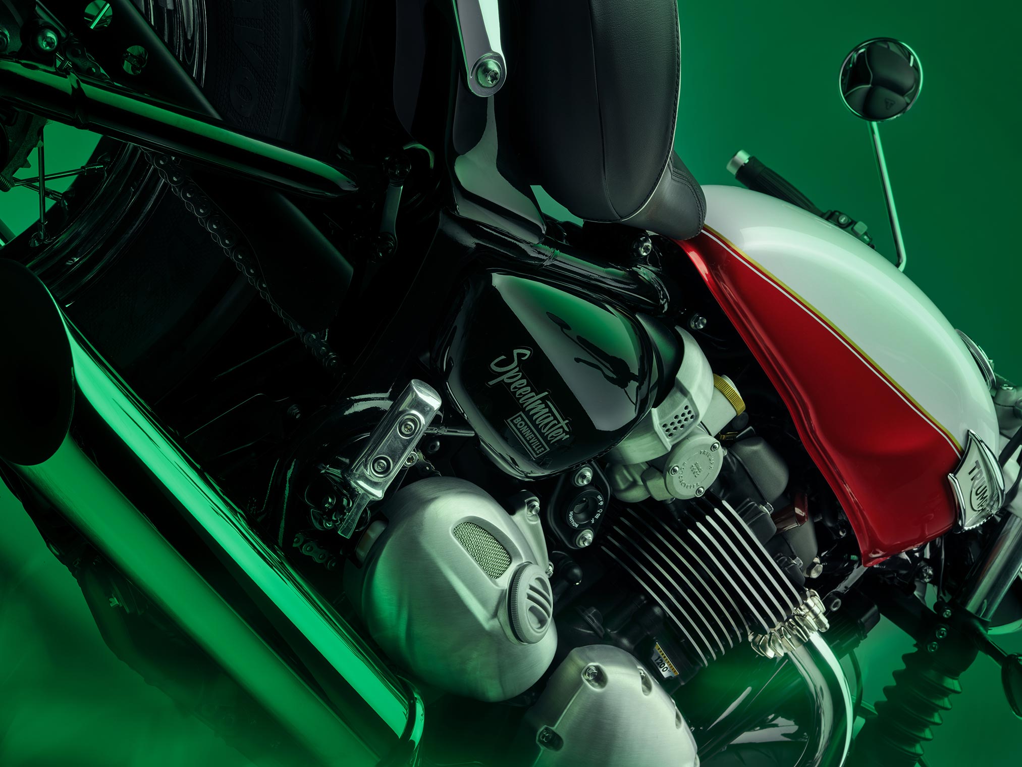 Authentic touches enhance the Speedmaster’s iconic style, with minimal bodywork, a sculpted 12 litre Bonneville tank, nacelle headlight detailing, and a distinctive hard tail look ‘cage’ swingarm.
