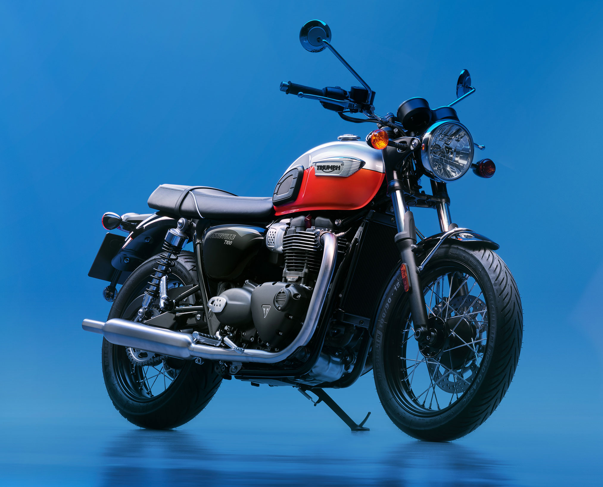 Adopting a similar two-colour tank scheme with Triumph’s famous hand-painted pinstripe, the iconic Bonneville T100 is available with a stylish new Aluminium Silver & Baja Orange tank, with Jet Black mudguards, headlight bowl and side panels. The legendary Bonneville T120 dazzles with a Crystal White & Cranberry Red tank, complemented by Jet Black mudguards, headlight bowl and side panels.