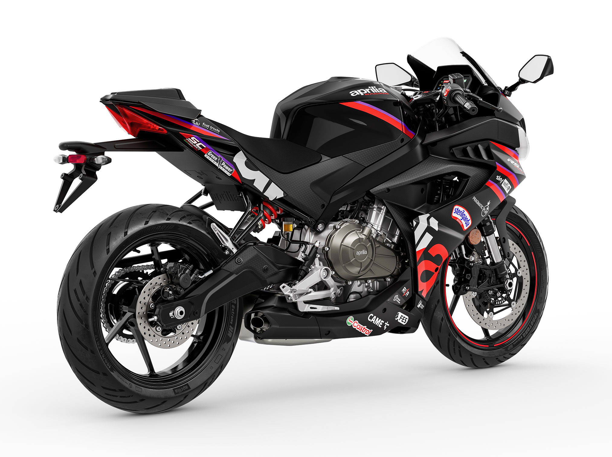 It is now available in a truly unique version, with even better equipment and all-exclusive graphics. The RS 457 GP Replica boasts even better sporty riding performance, thanks to the super-useful quick shift, which allows the rider to shift up and down without using the clutch, just like on a real racing bike. Furthermore, the front brake pads have a higher friction coefficient, which enable even more effective braking. The special RS 457 GP Replica set-up is completed by the single-seat passenger saddle cover and the new black finish for the aluminium frame, swingarm and steering plate.