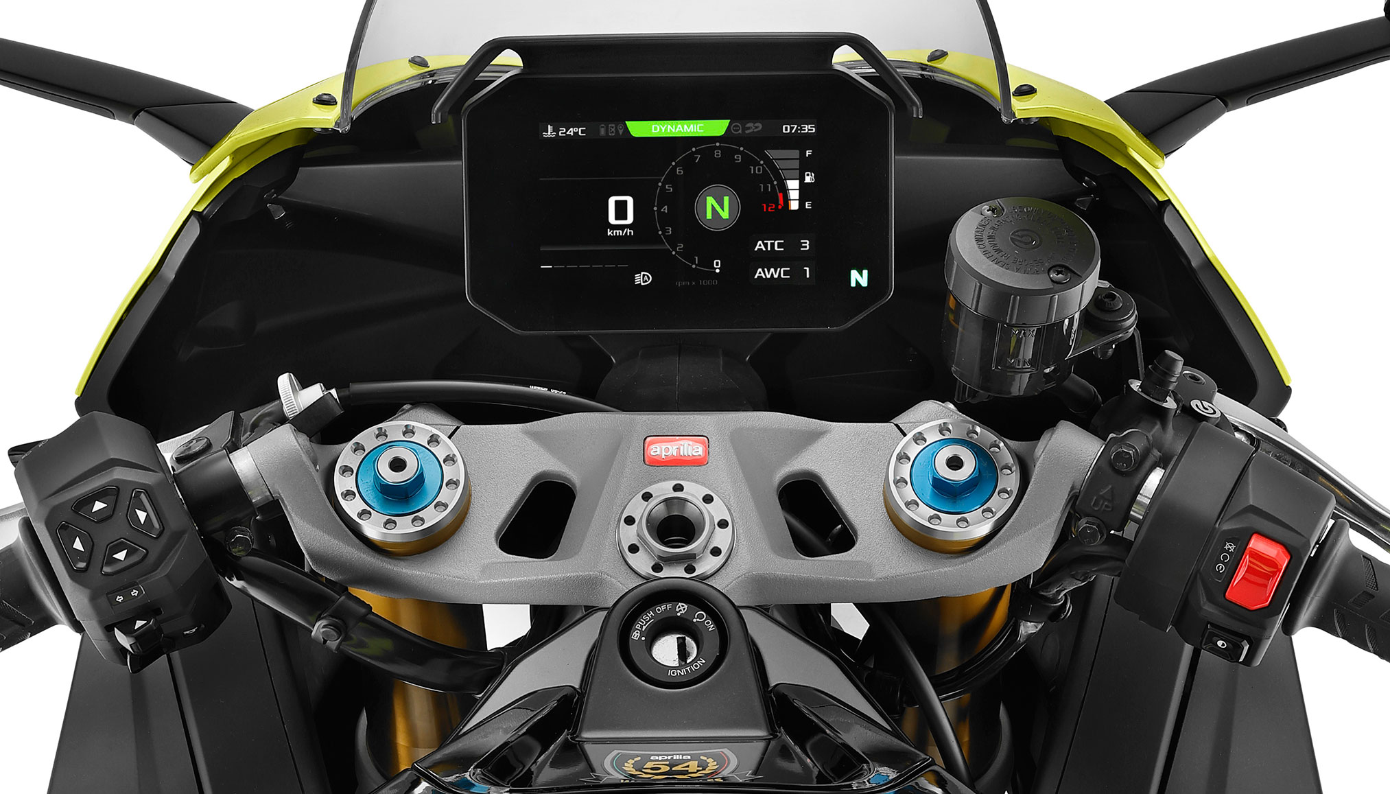 The Aprilia RS 660 Factory takes electronics to a competition level, unlocking your next step in performance. The APRC (Aprilia Performance Ride Control) package integrates a comprehensive system of electronic controls such as Launch Control which ensures lightning-fast starts. With multimap Cornering ABS for optimised braking when the bike is leaning, and a Ride-by-Wire electronic throttle, the RS 660 Factory brings more technology and action to the road. The backlit handlebar controls and the 5” full-colour TFT display with optical bonding provide perfect visibility in all conditions.